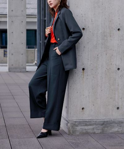 ・縦にきれいに落ちるラインが特徴のヘムダブルワイドパンツ。