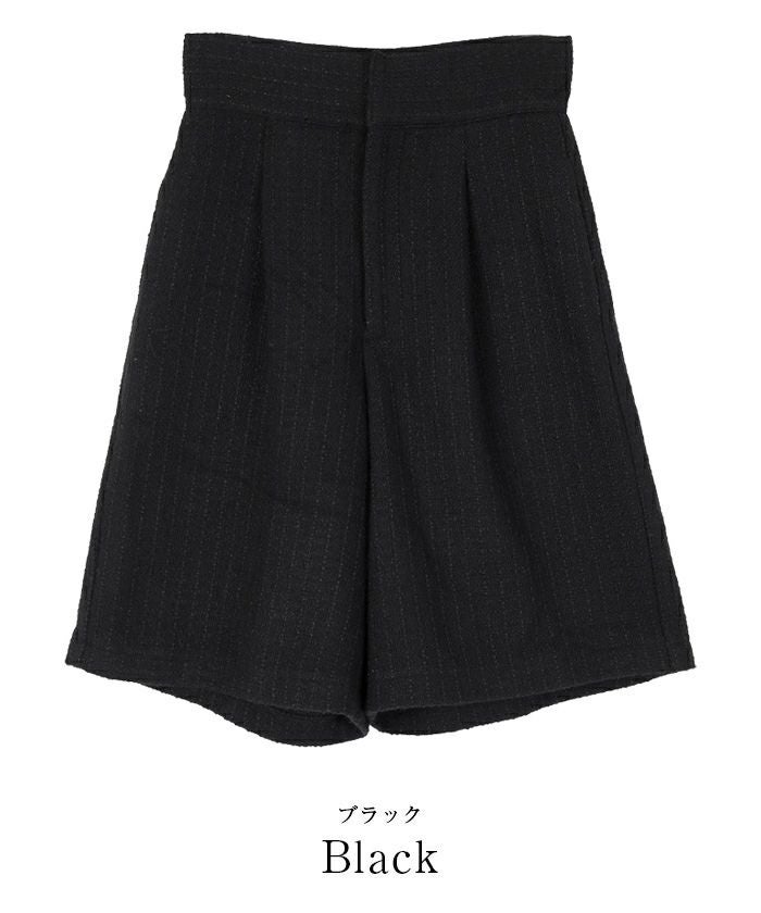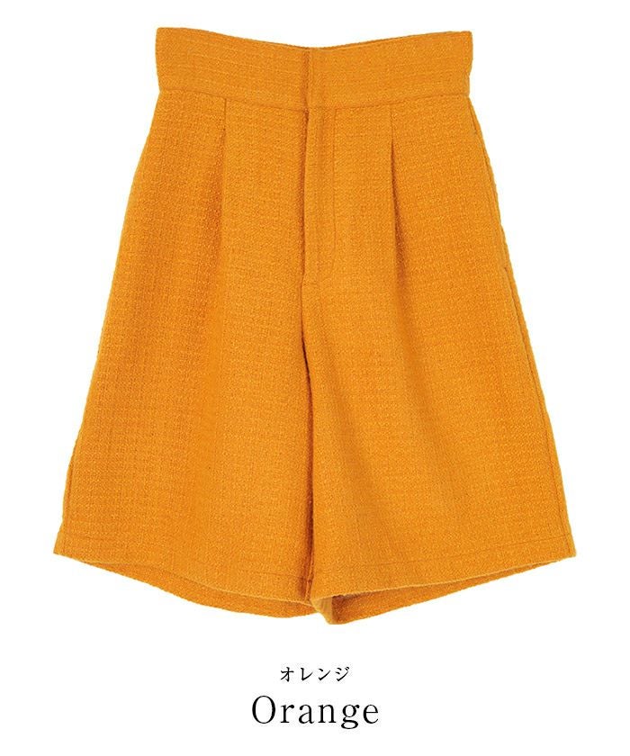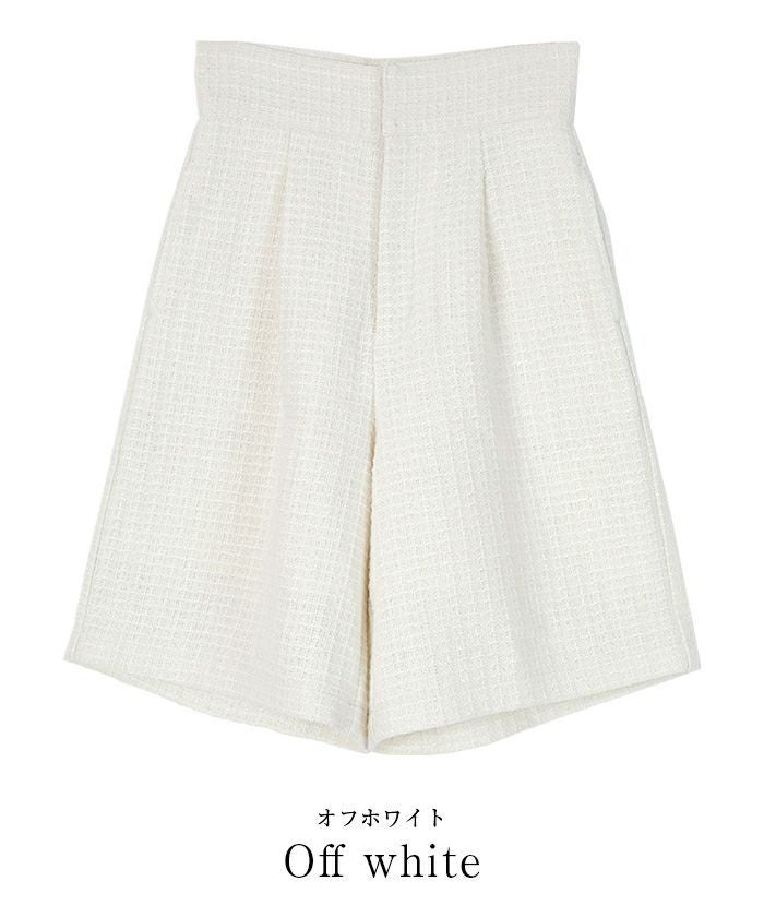 ハイウエストベルトでスタイルアップ効果も期待できるツイードハーフパンツ。