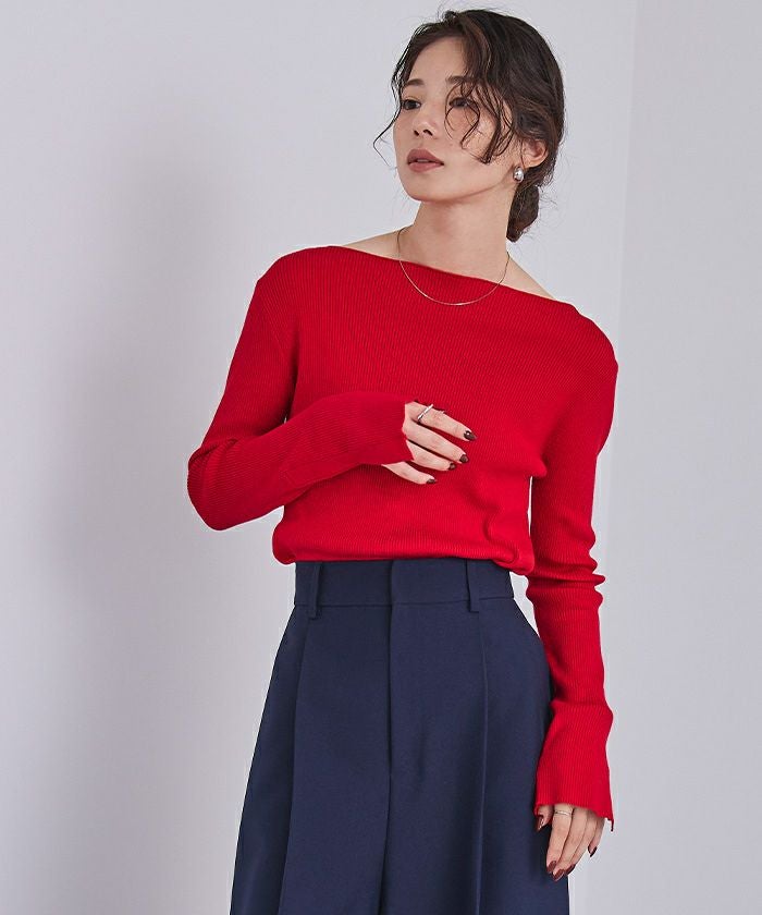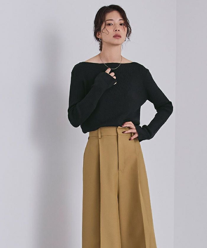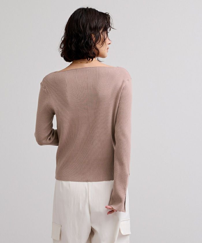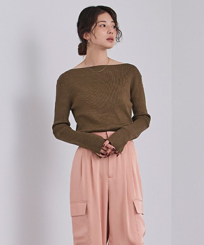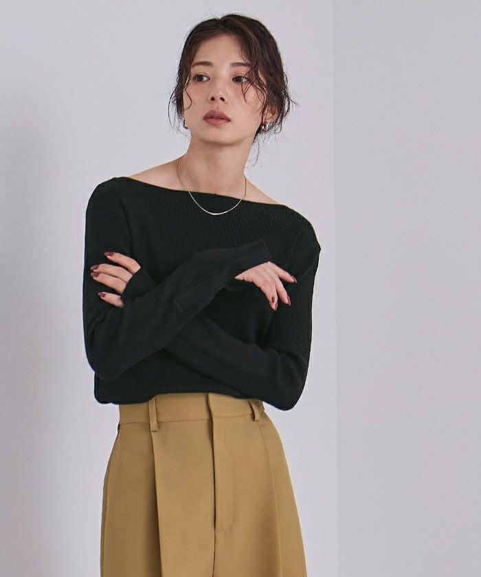 ボートネックでデコルテを綺麗に見せられるシンプルなリブニット。