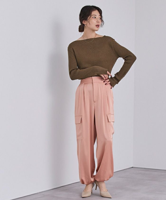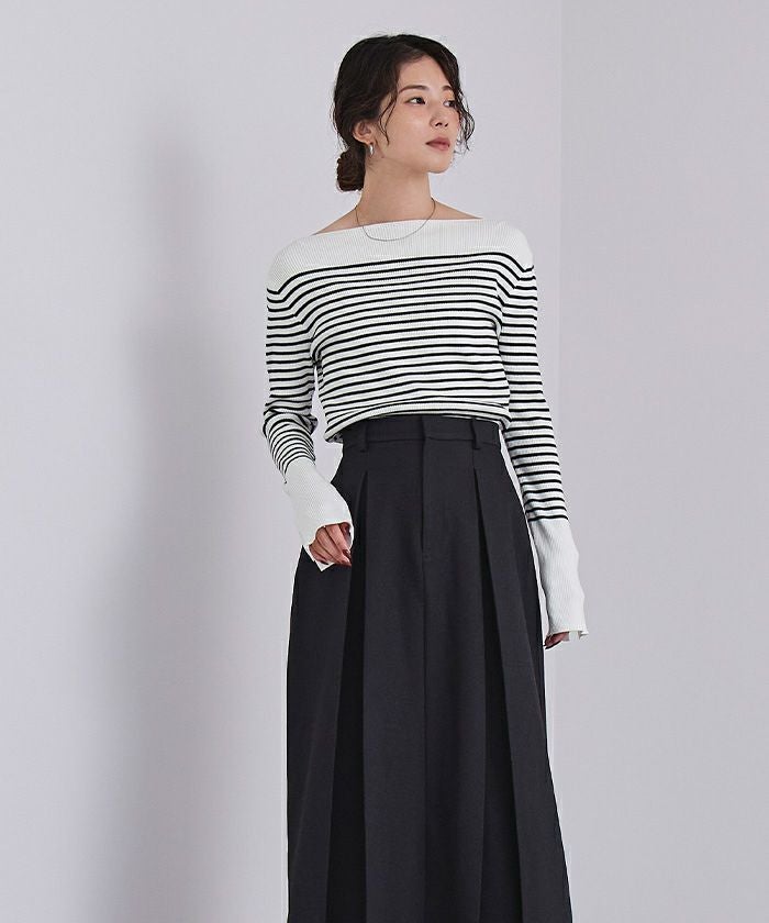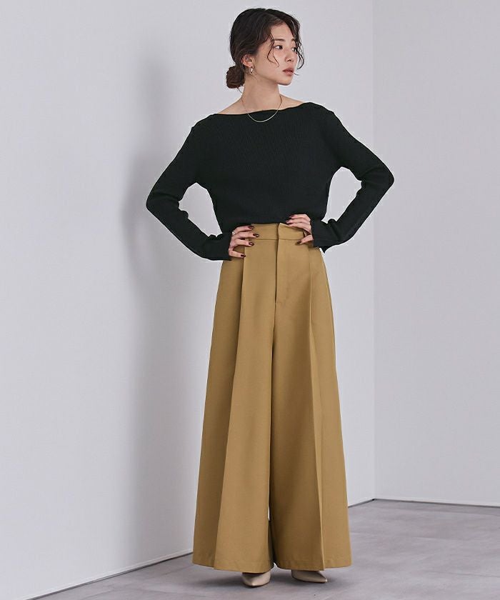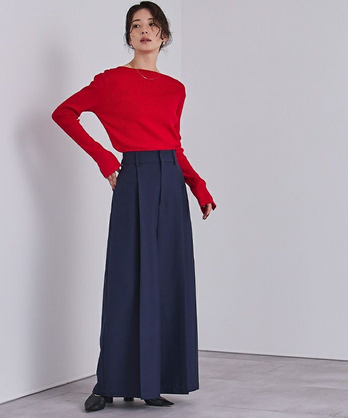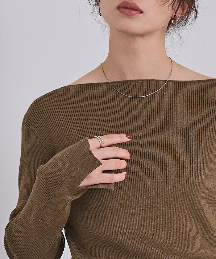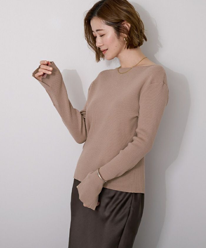 ボートネックでデコルテを綺麗に見せられるシンプルなリブニット。