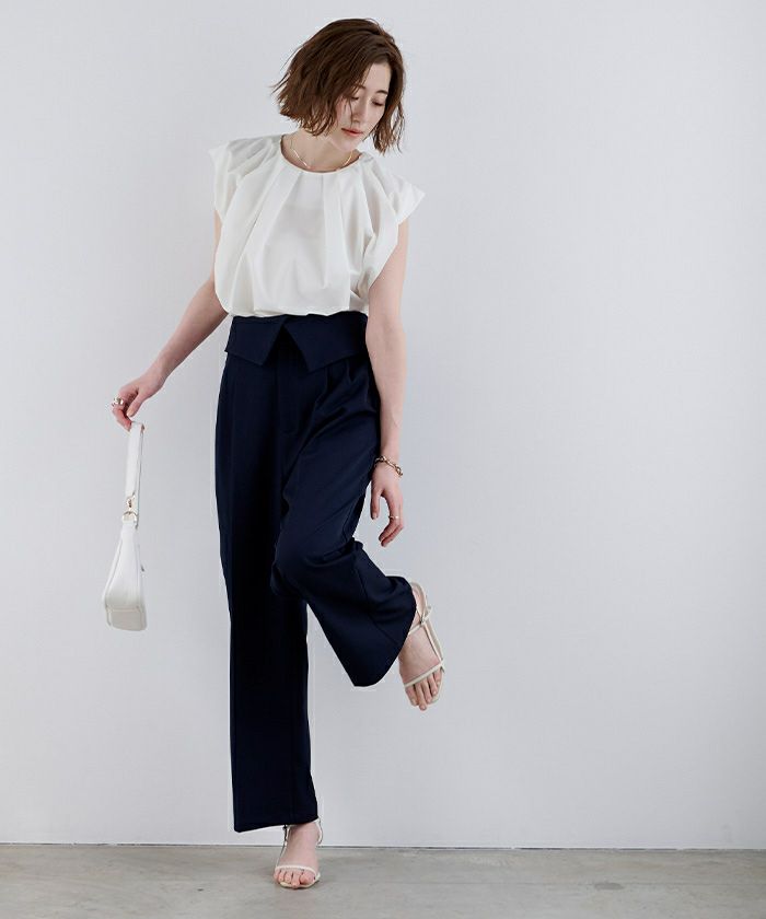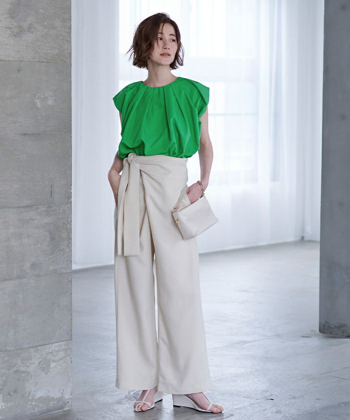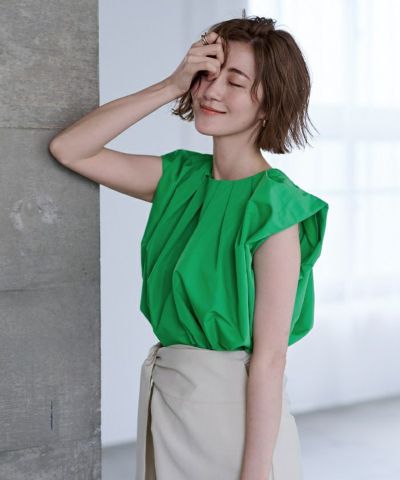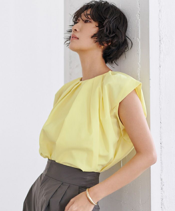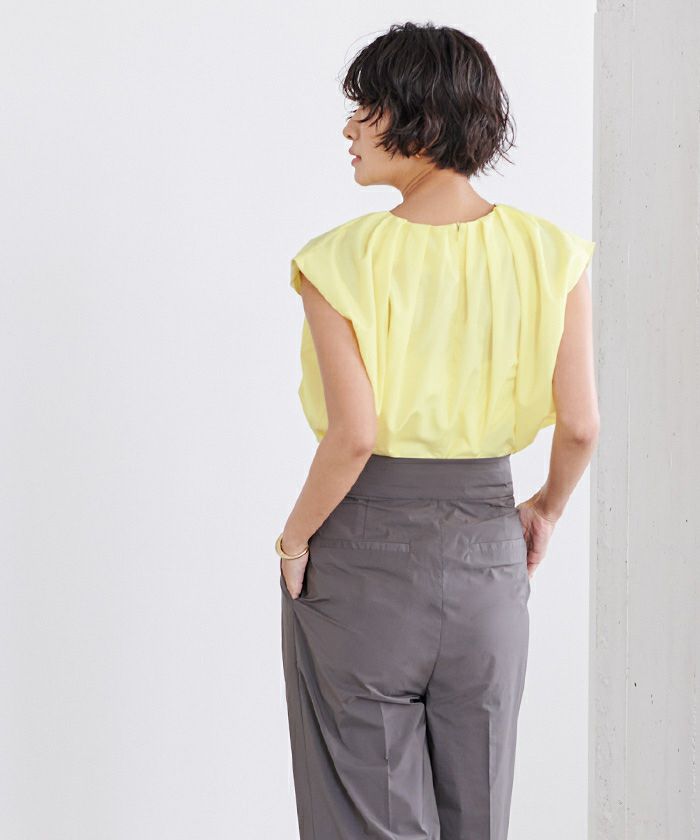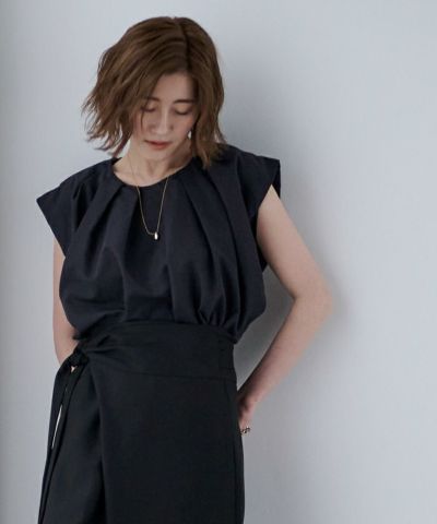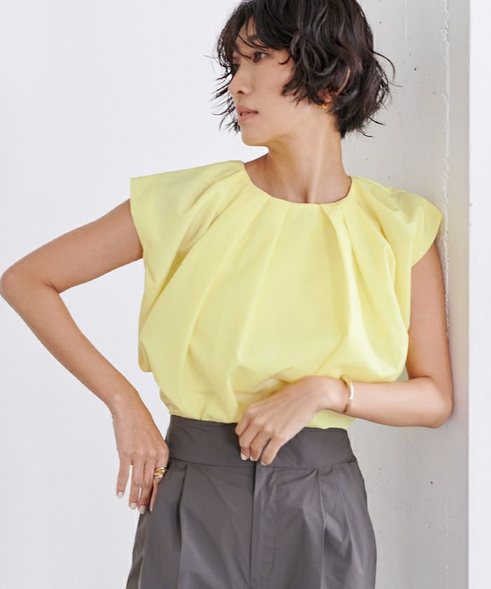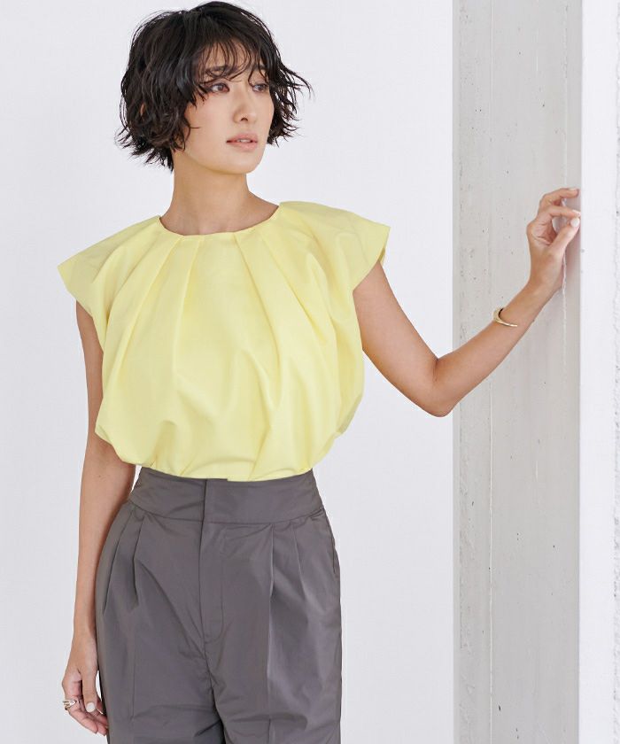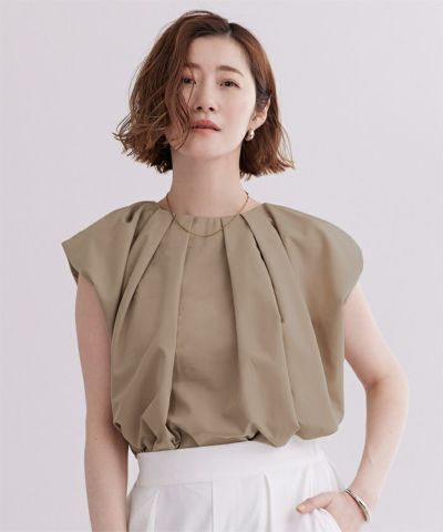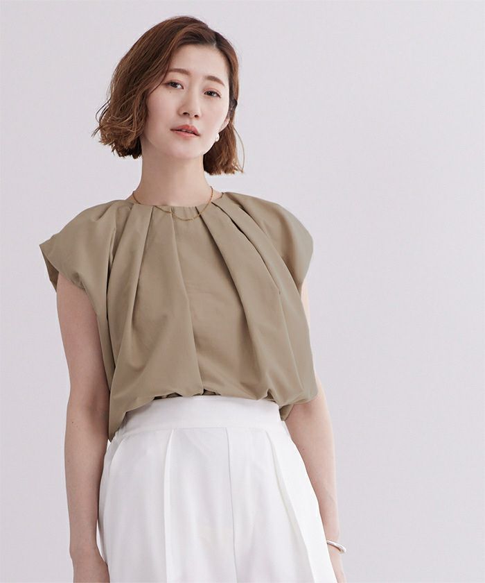 襟ぐりにタックが入っておりふんわりとボリュームのあるトップス。