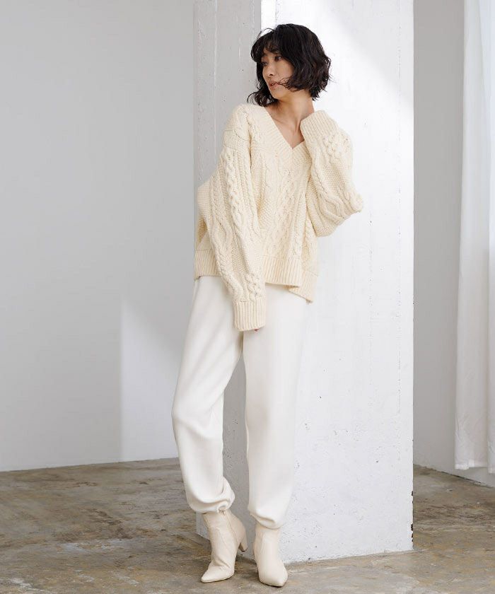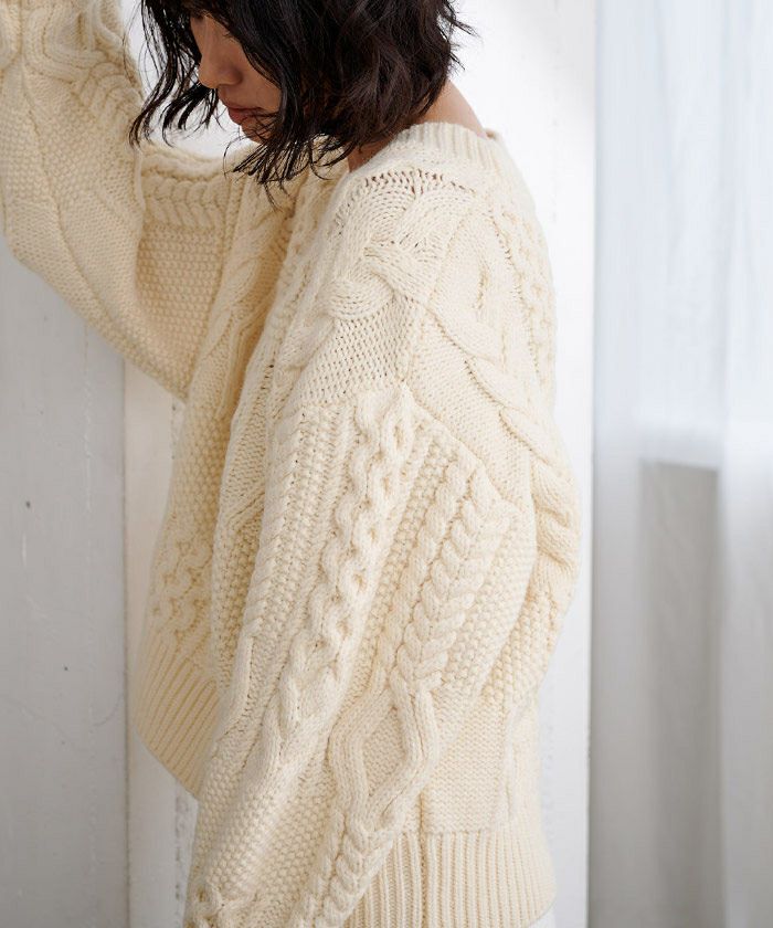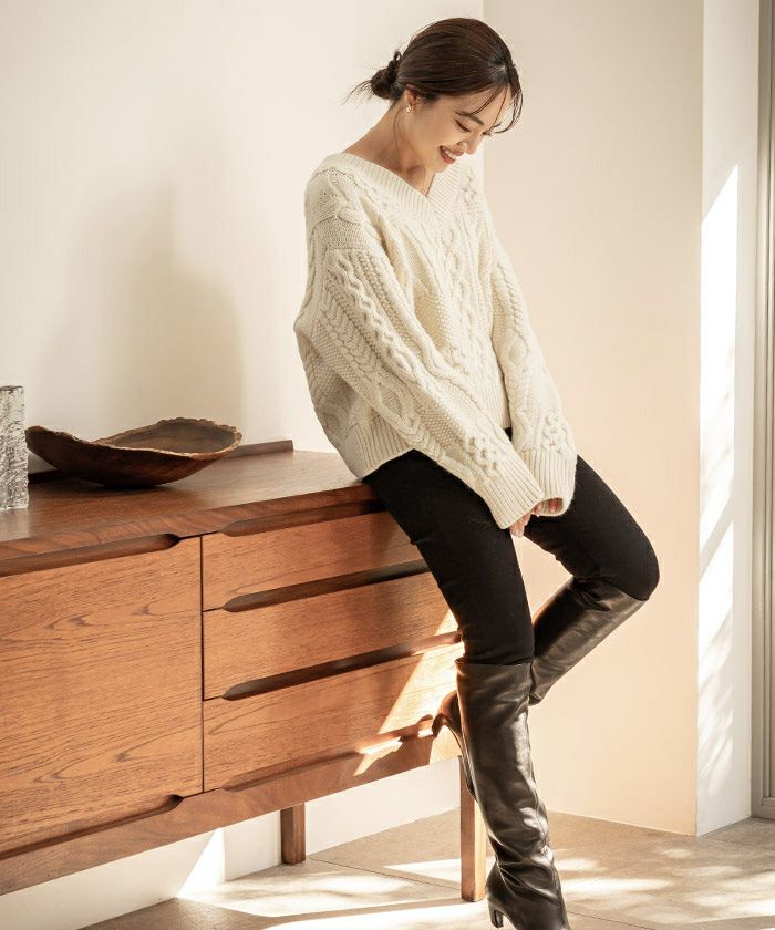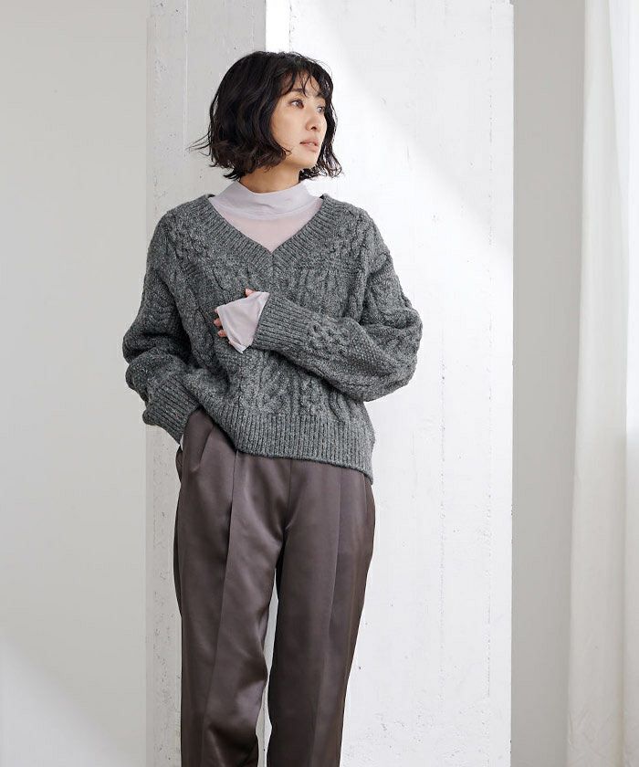 ボリューム感がありながらもVネックですっきり見えするケーブルニット。