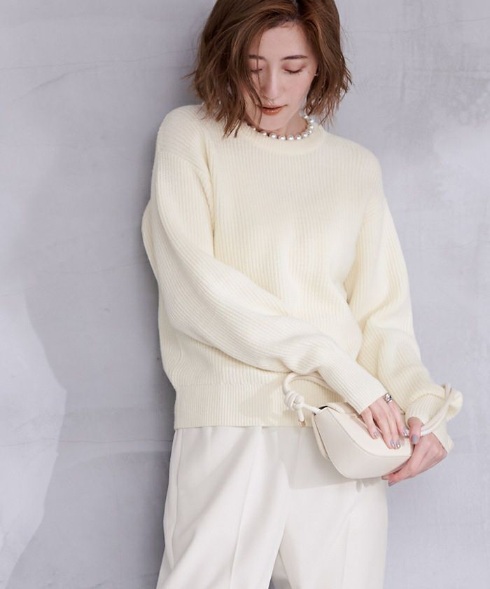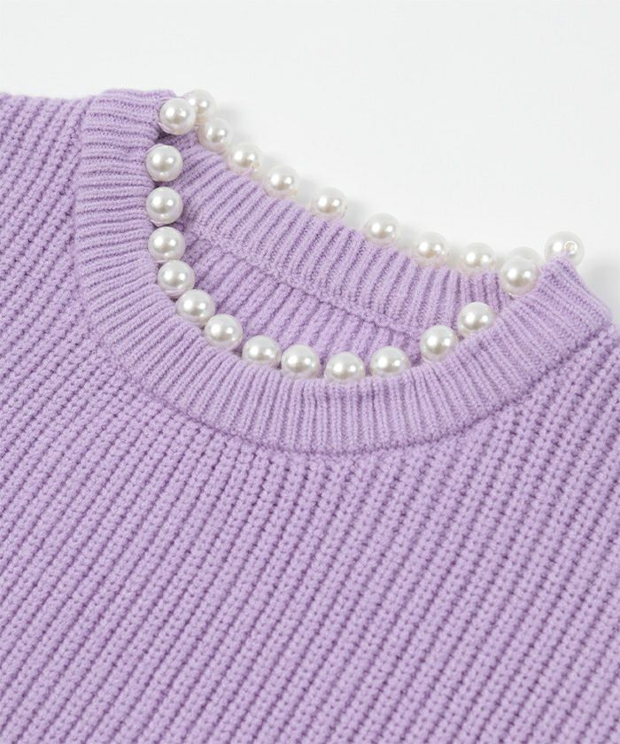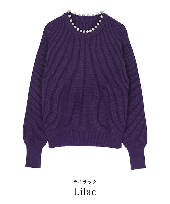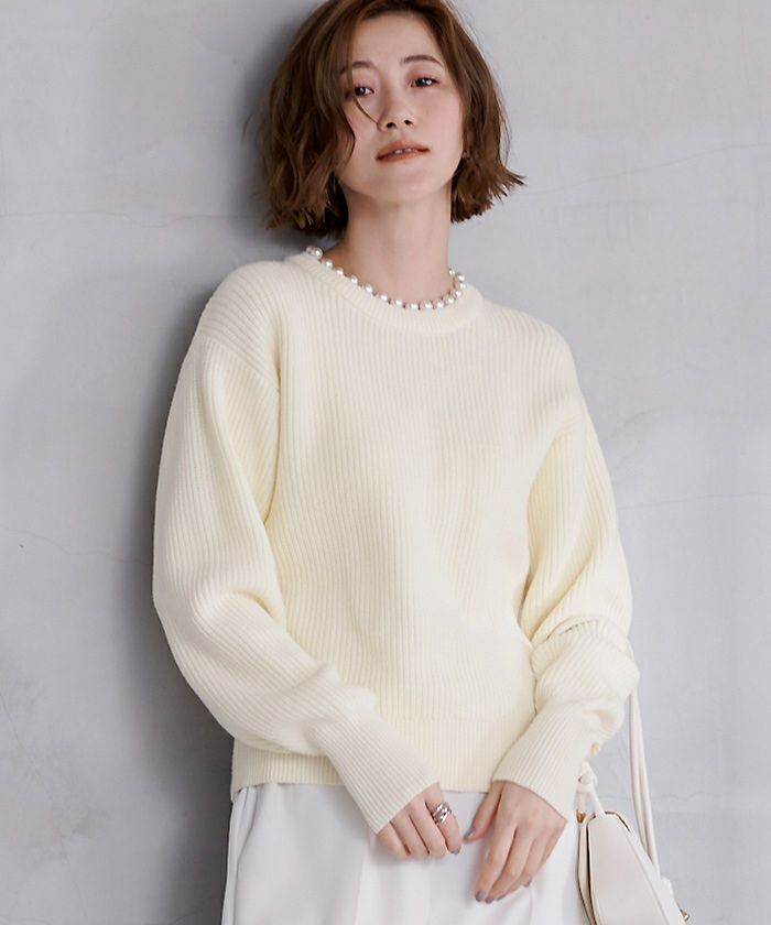 ネック部分にパールを施したクルーネックニット。