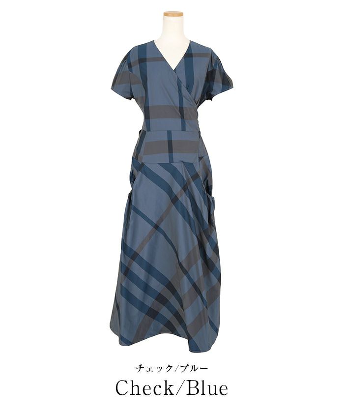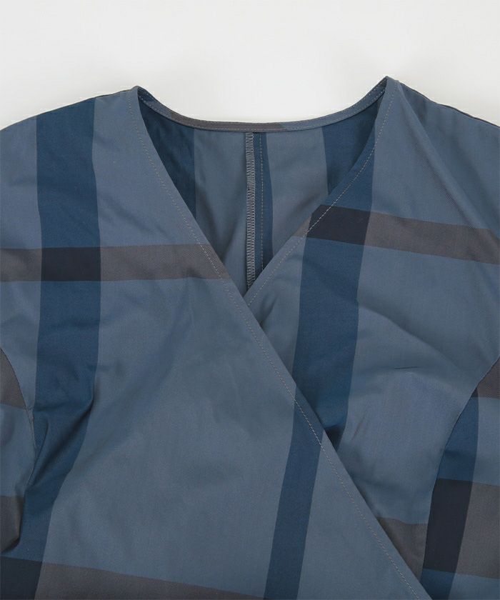 カシュクールデザインに後ろリボンで着用するとすっきりとした見え方に。