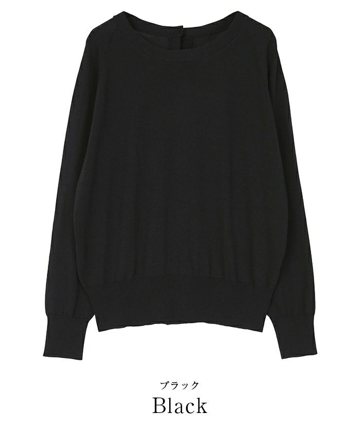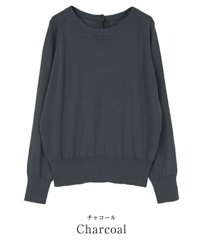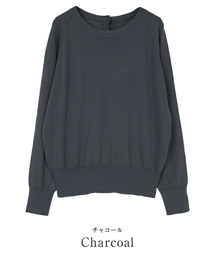 開きすぎないラウンドネックに背中ゴールド釦を施したカーディガン風のデザインです。
