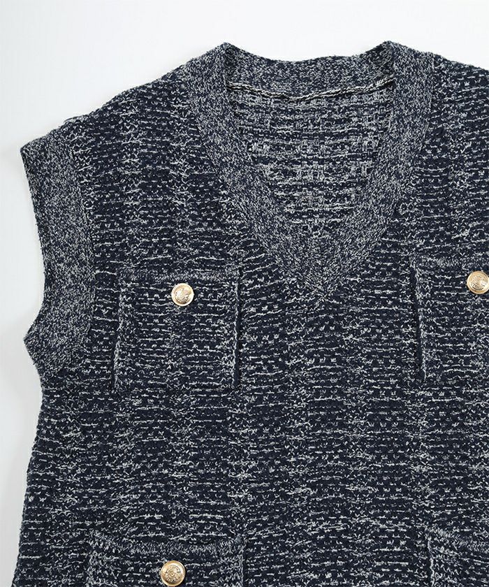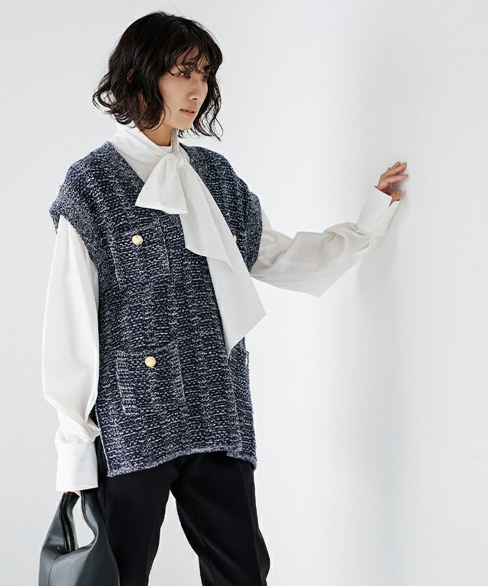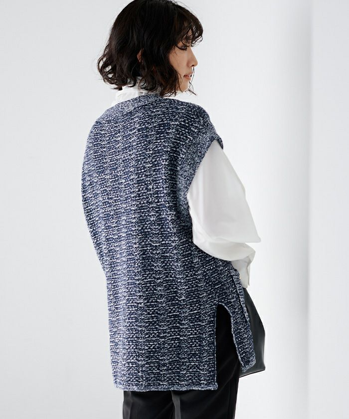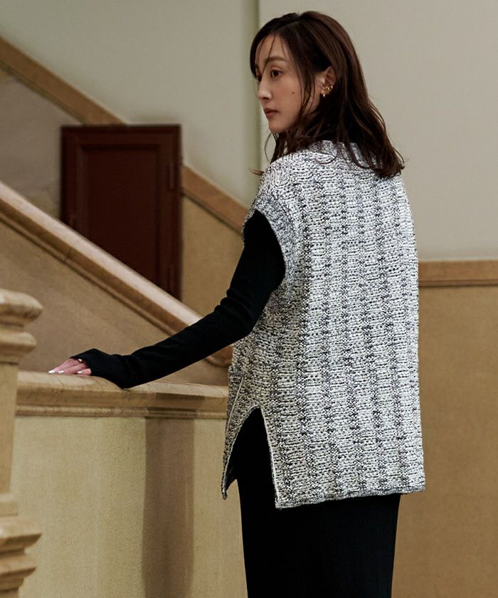 ベーシックなシルエットをツイードニットにした大人ベスト。