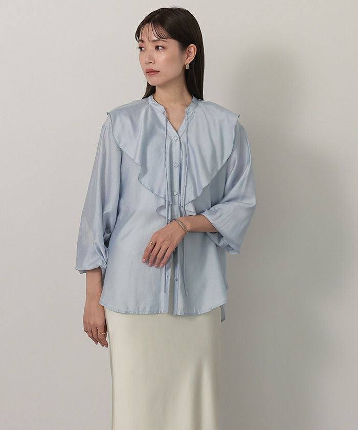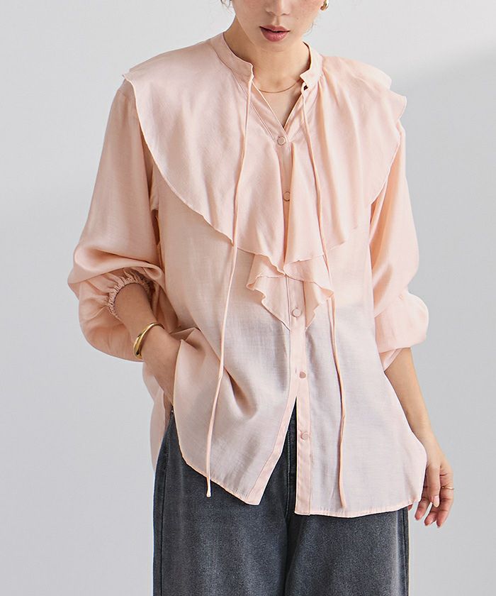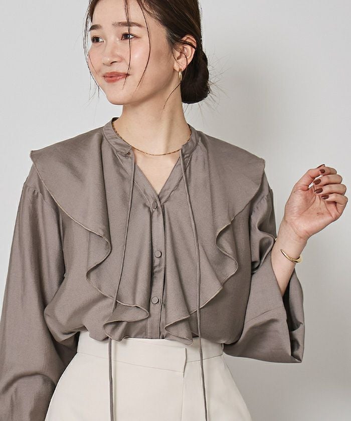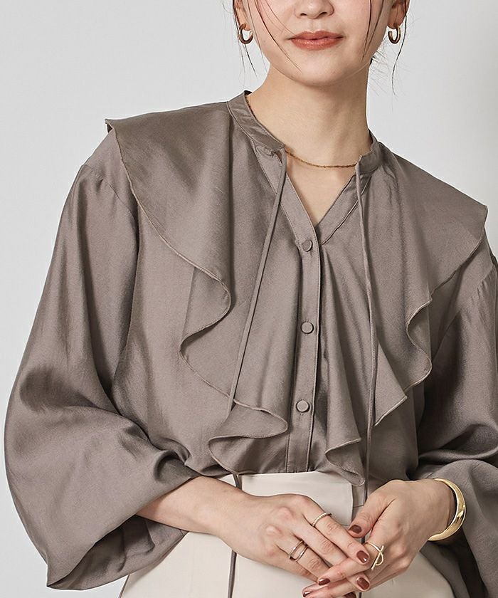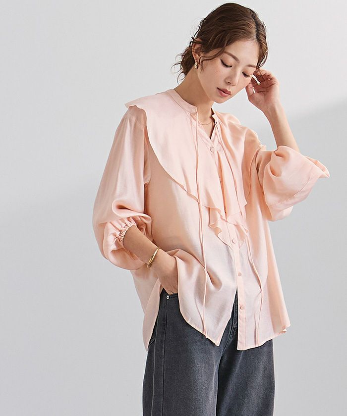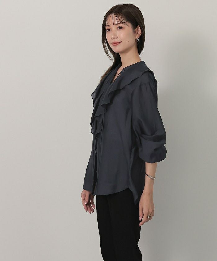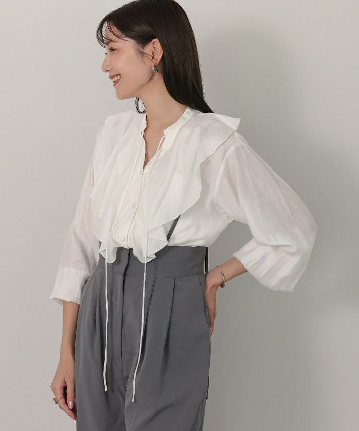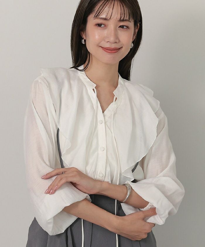 今年のドレッシーなムードに合うラッフルカラーデザインのブラウス。