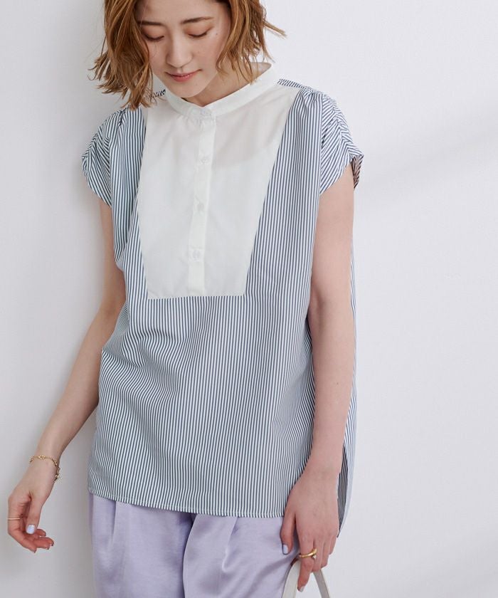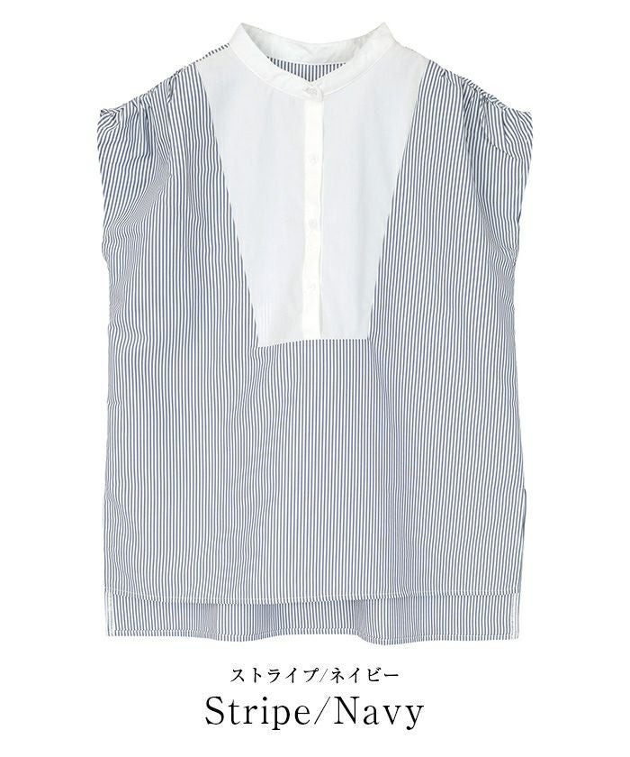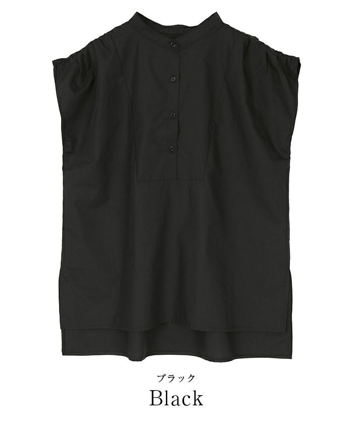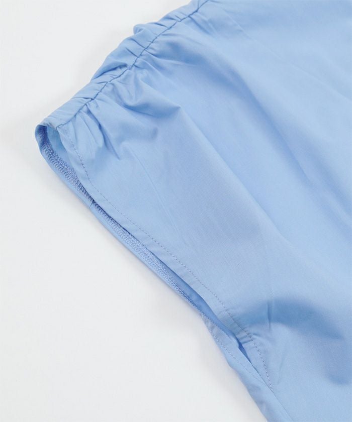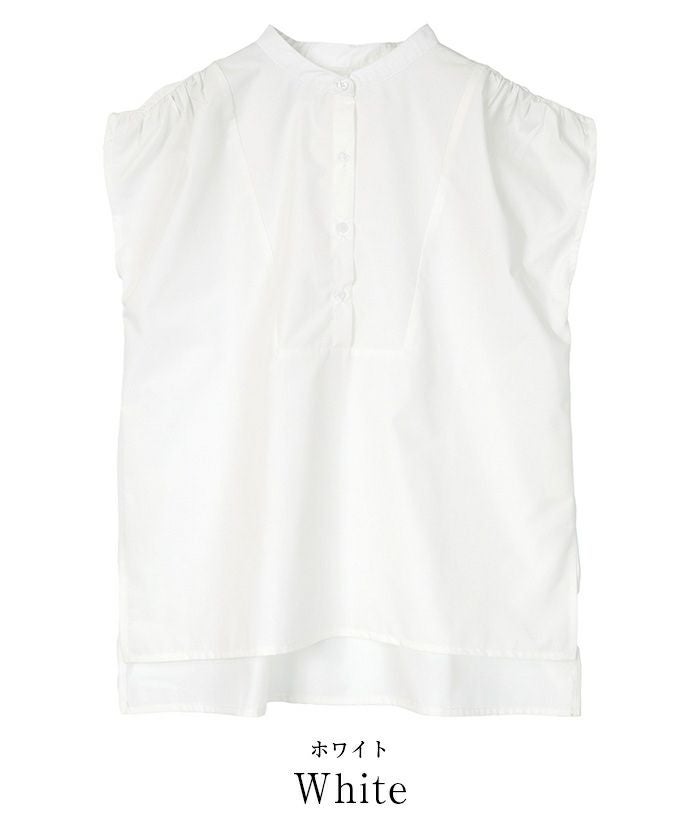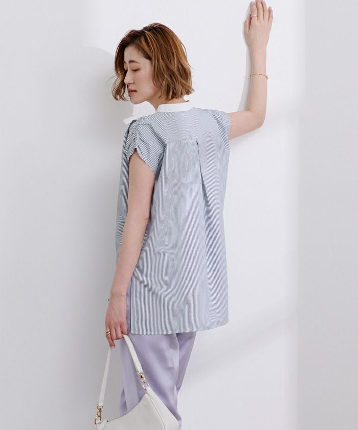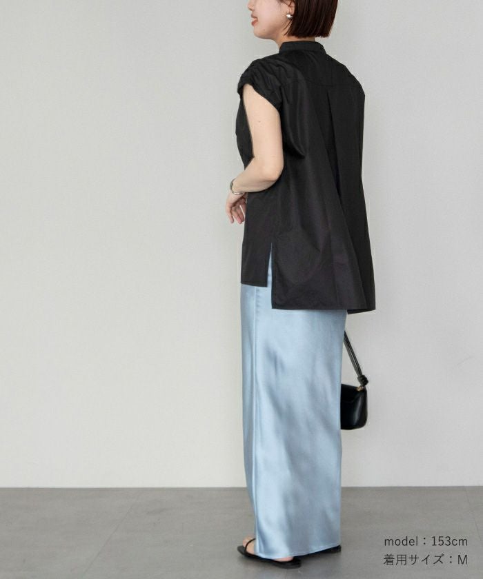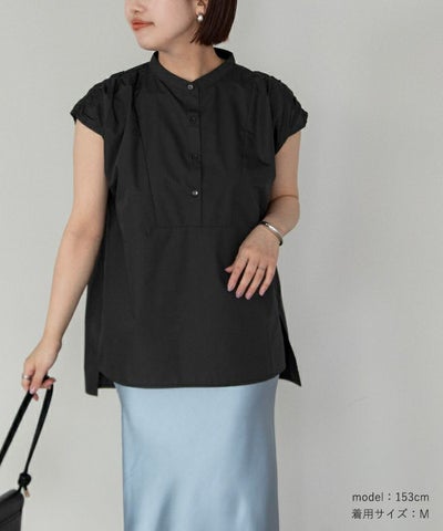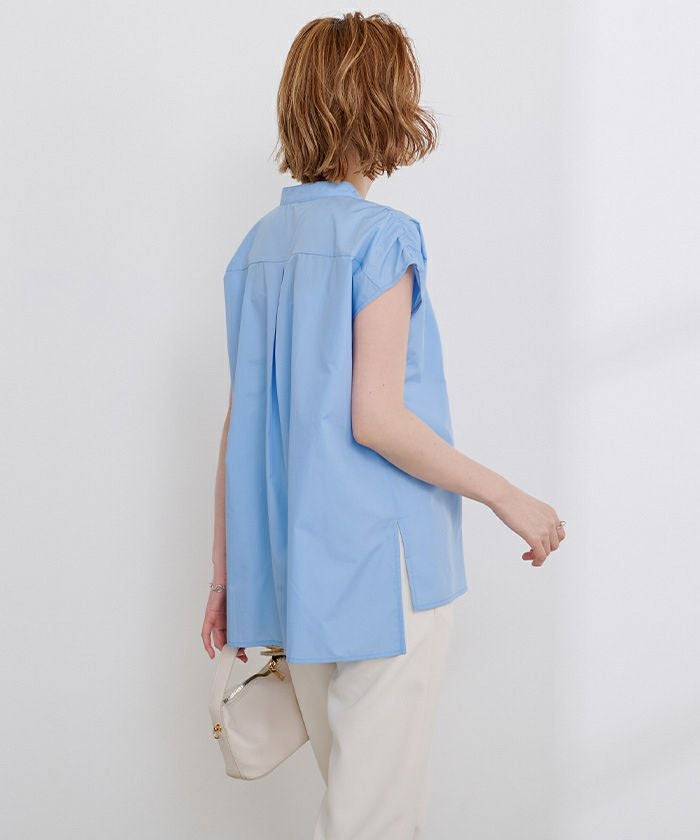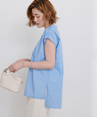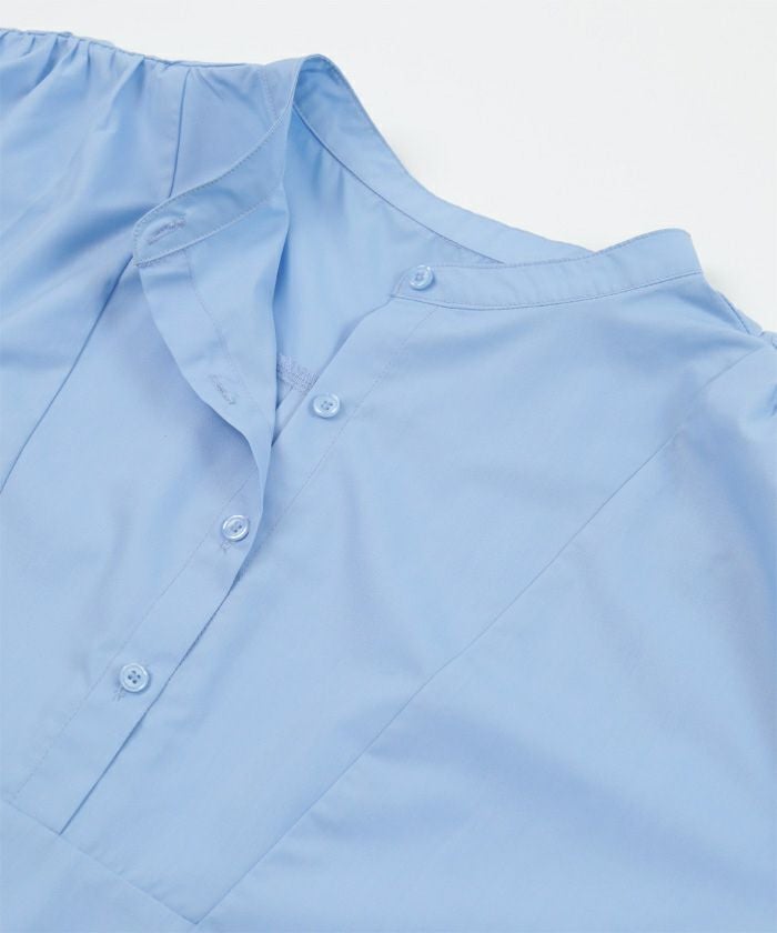 肩にギャザーを施したブザムシャツ。