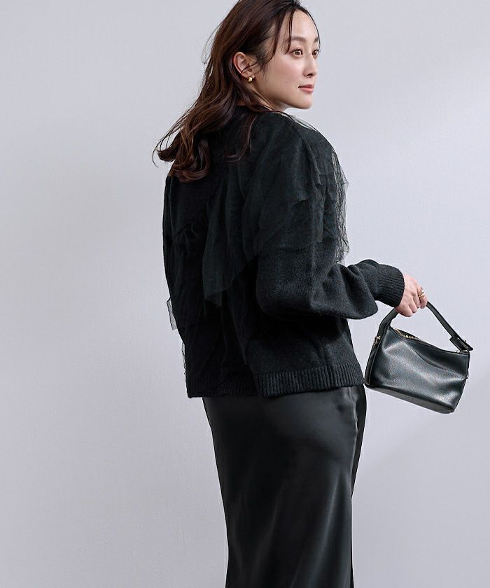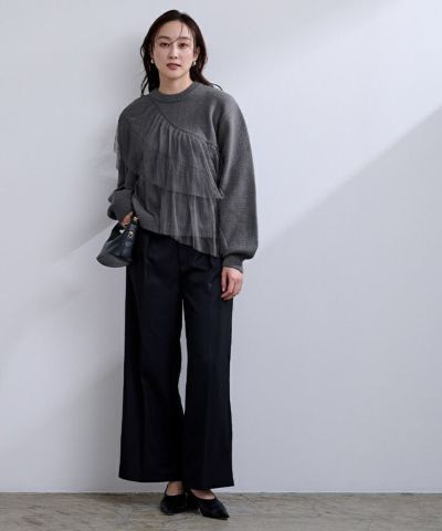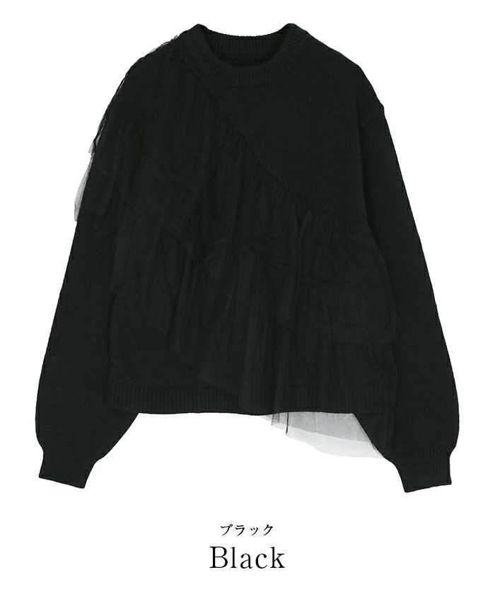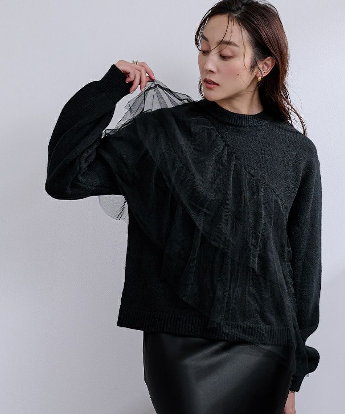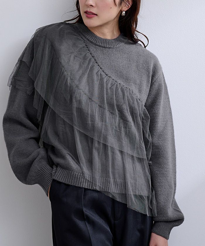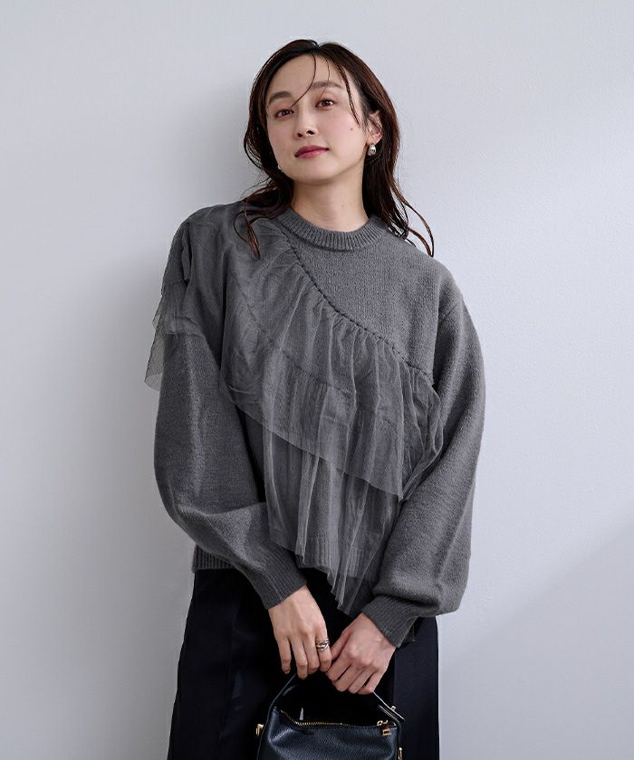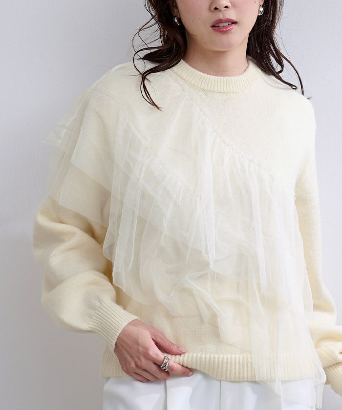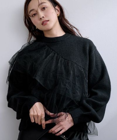 ゆとりのあるニットにコットンフリルをあしらったボリューム感のあるニットトップス。