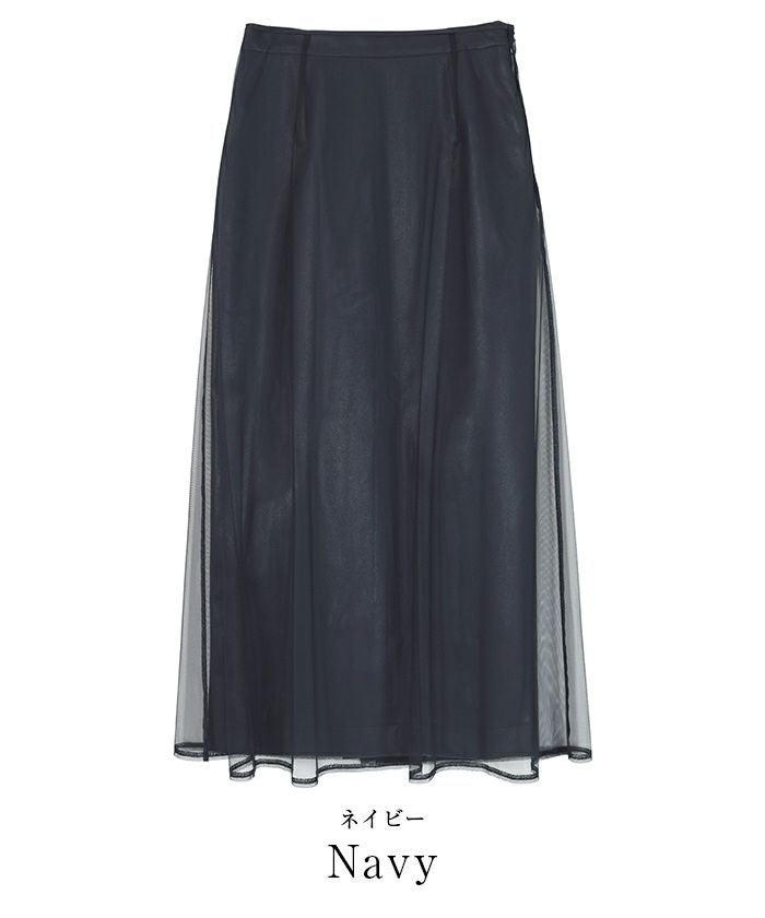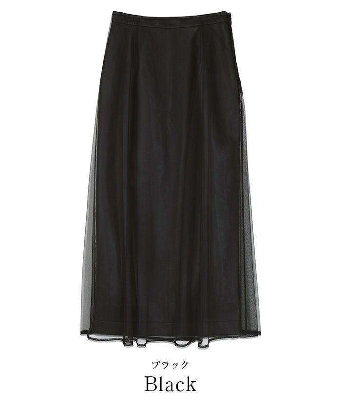 レザータイトスカートの上からチュールフレアスカートを重ねてレイヤードスタイルが楽しめます。