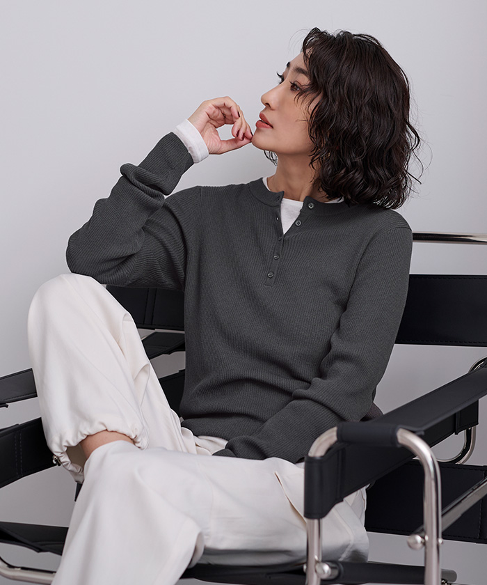 落ち感のある素材とセンタープレスが施されていてカジュアルすぎず着て頂けます。