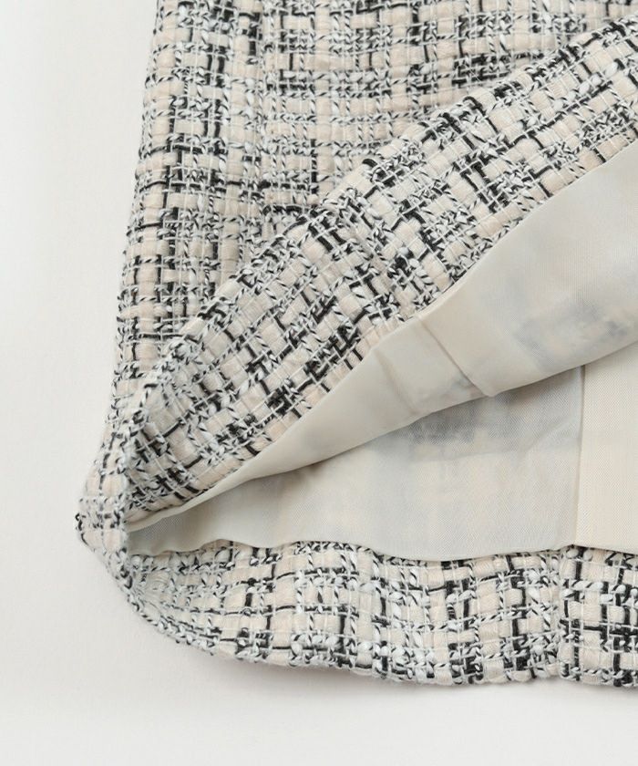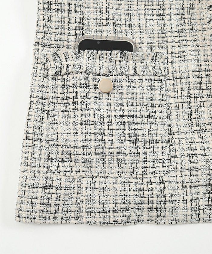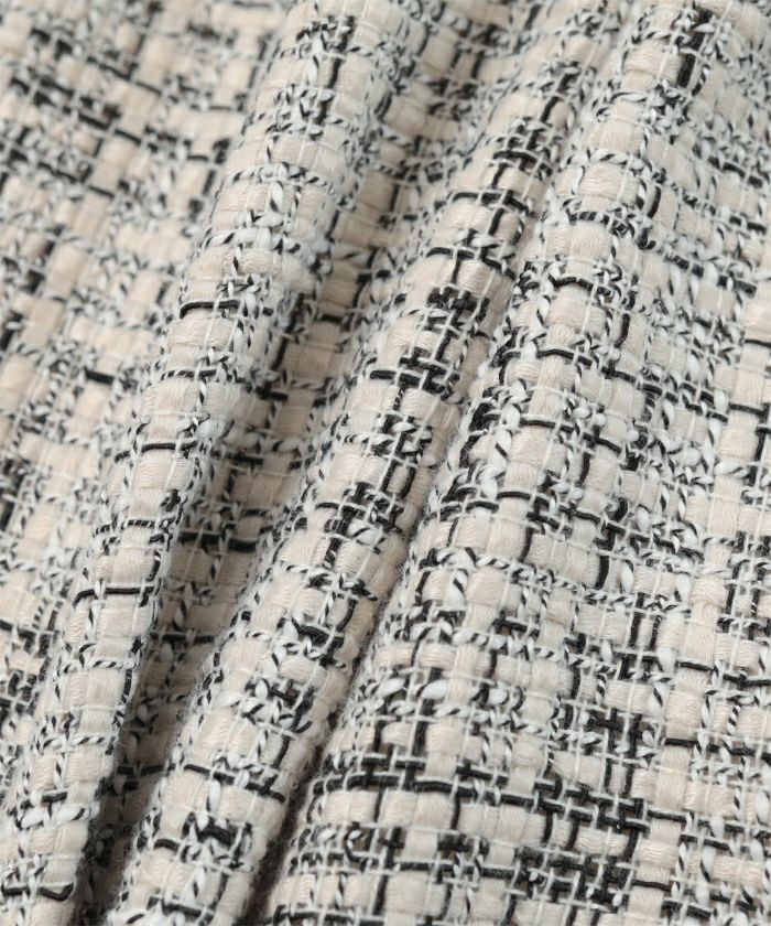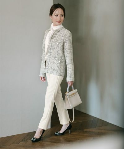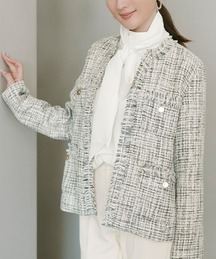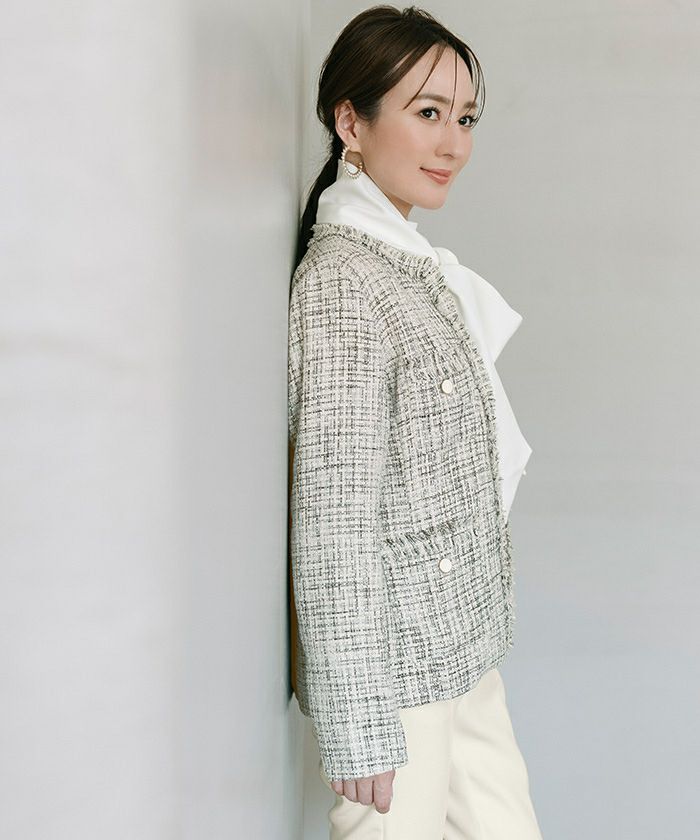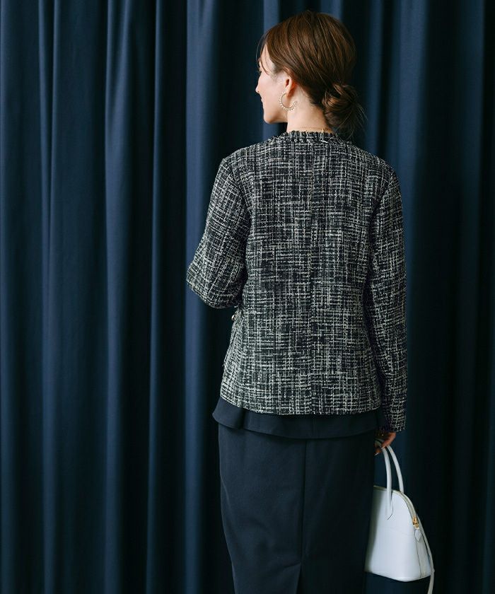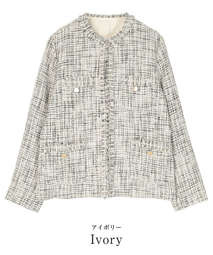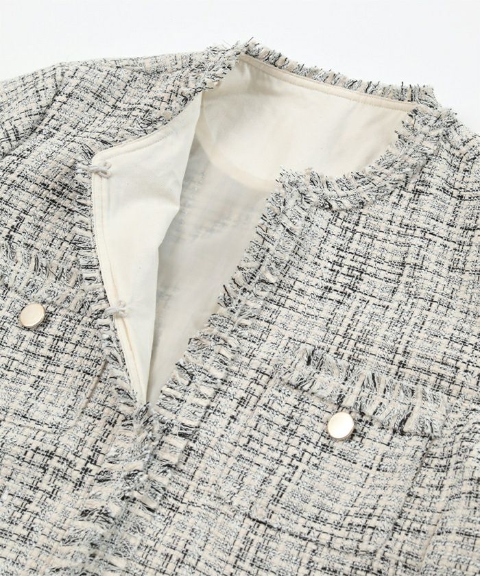 様々な色がMIXされたツイード素材のノーカラージャケット。