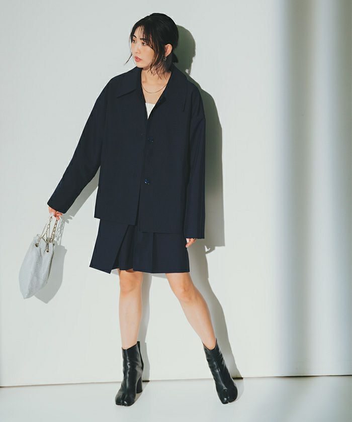 ステンカラーが今季らしく、襟の裏側には釦がついておりスタンドカラーのように着て頂くのも可能です。
