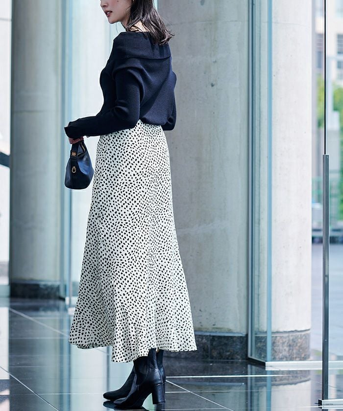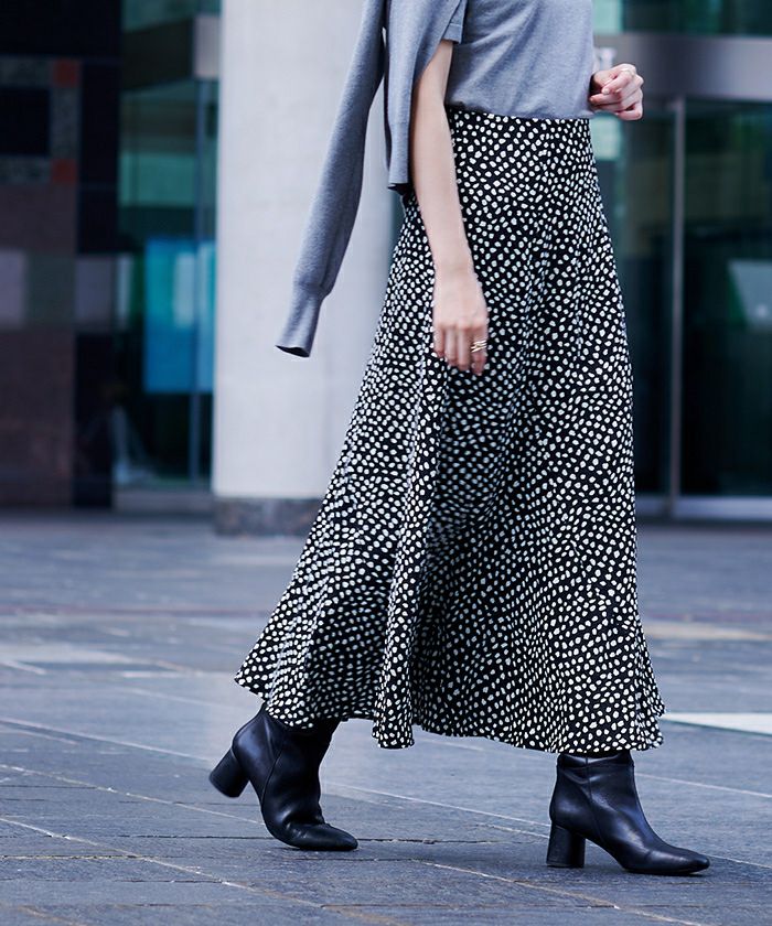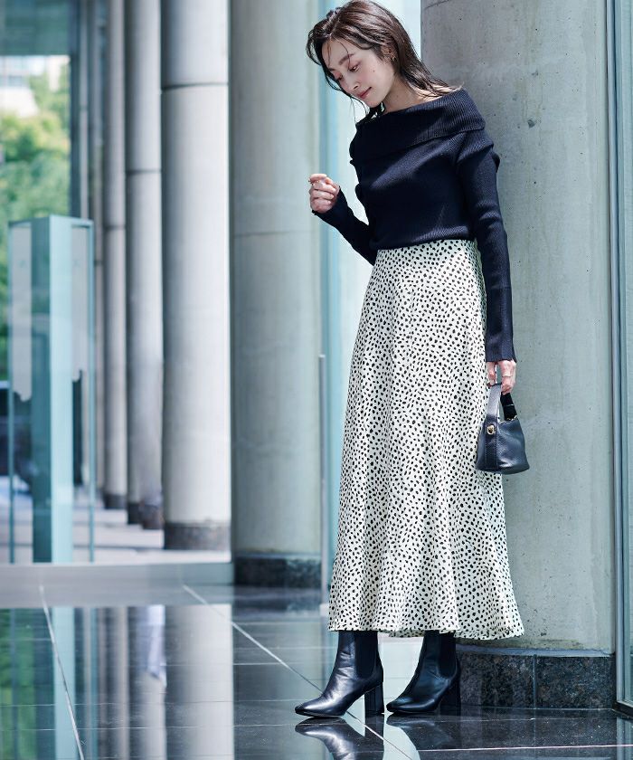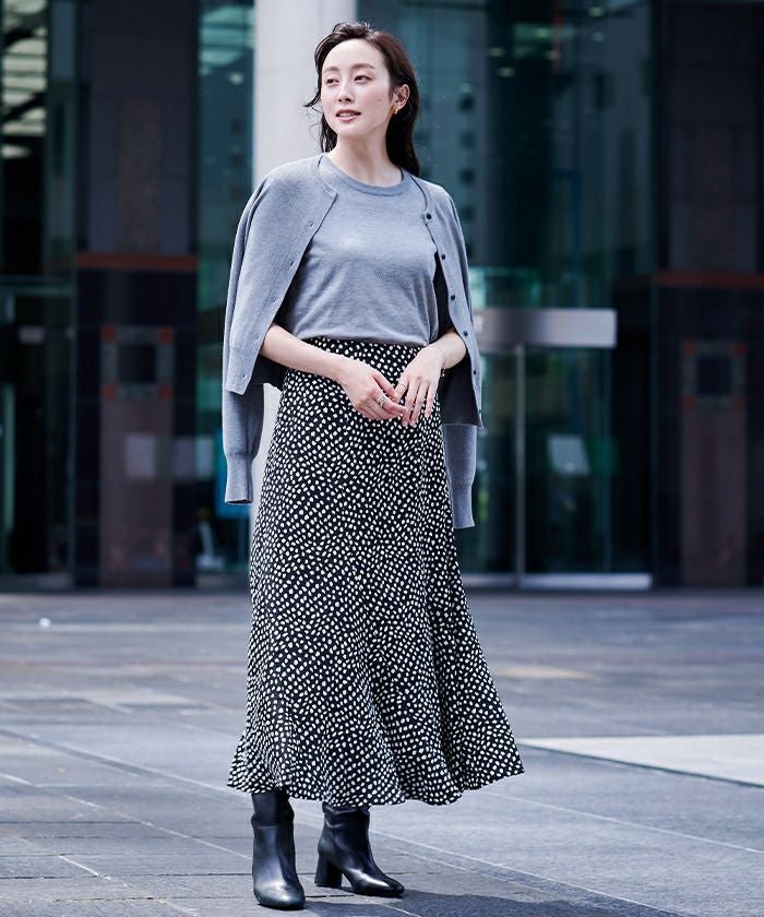 シルエットが広がりすぎないセミフレアスカートで甘くなりすぎず