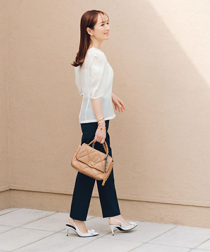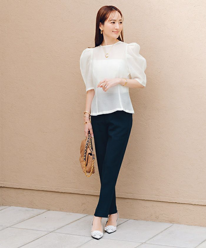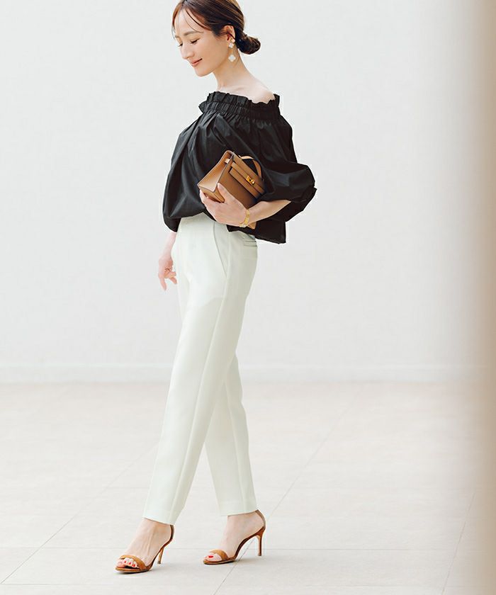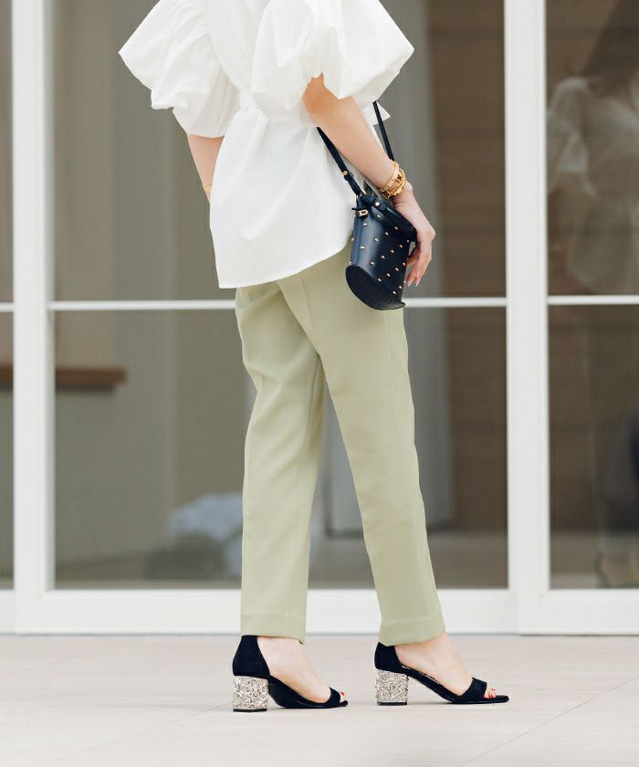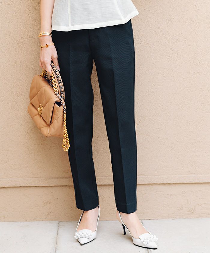 ハイウエストで脚長効果も期待できるスリムパンツ。
