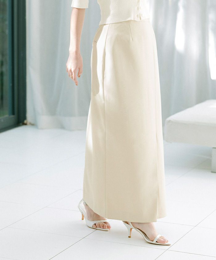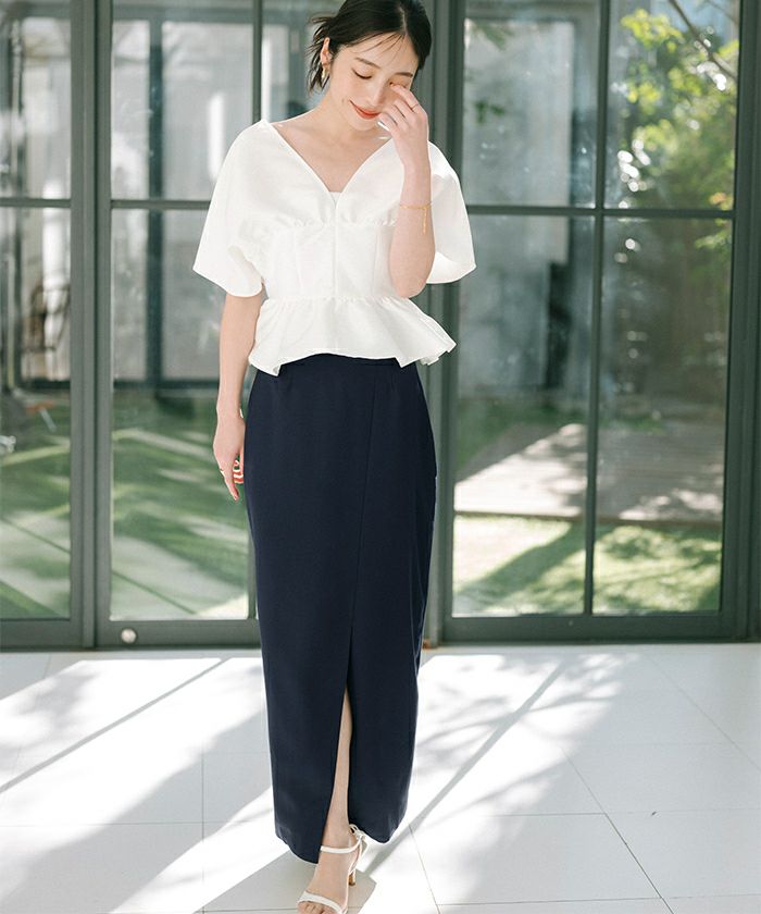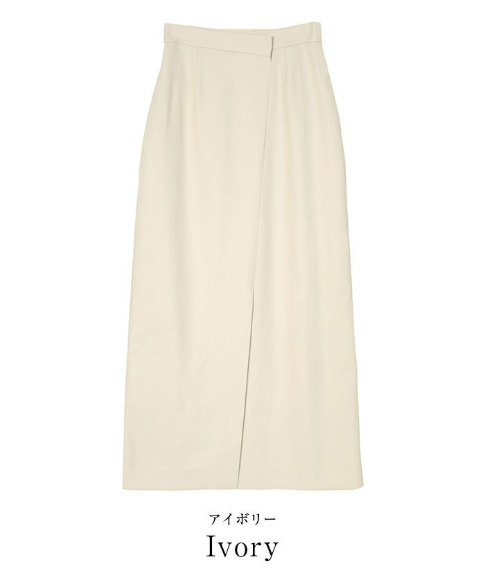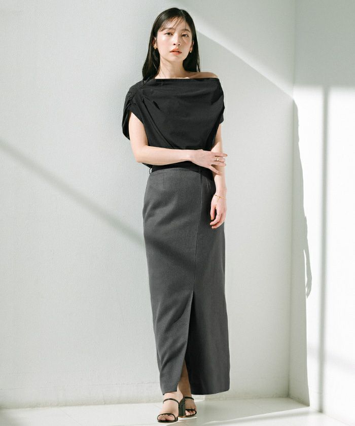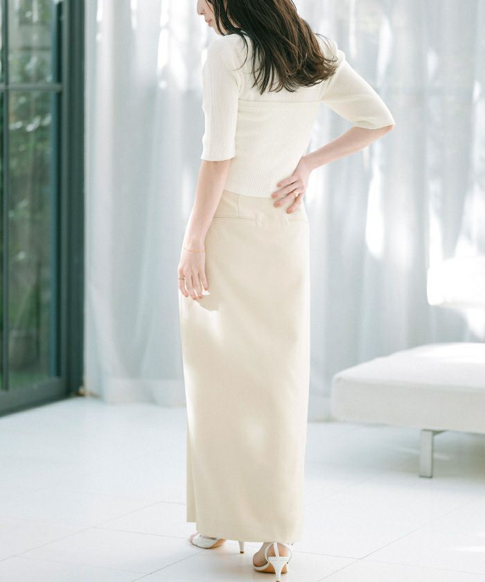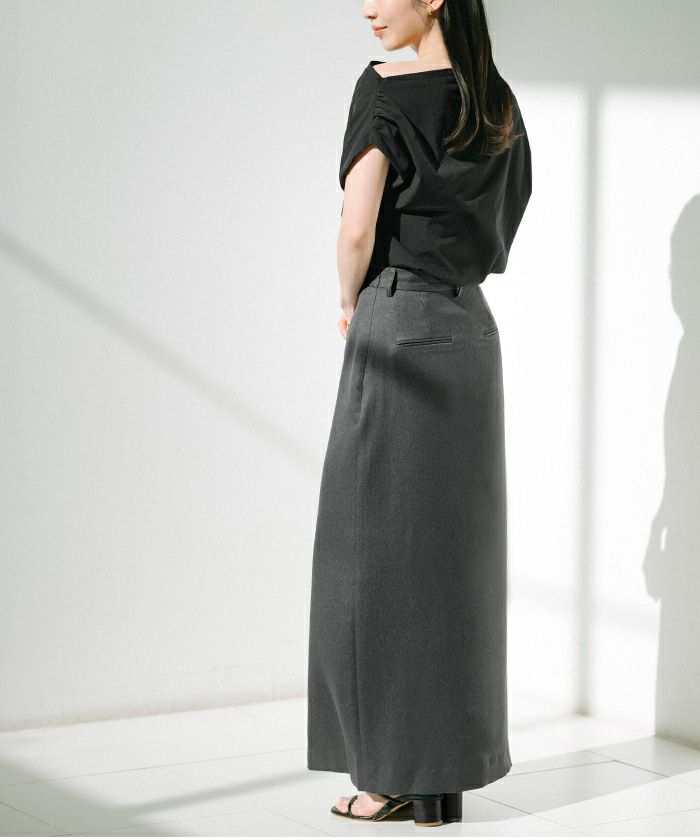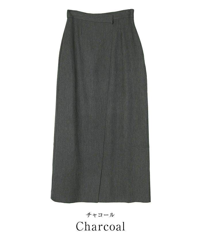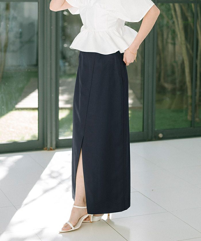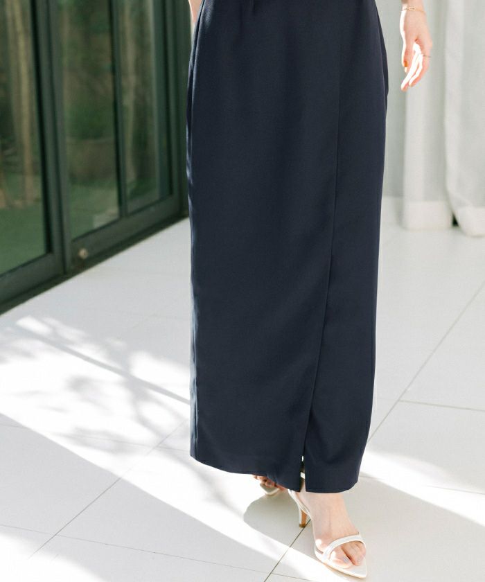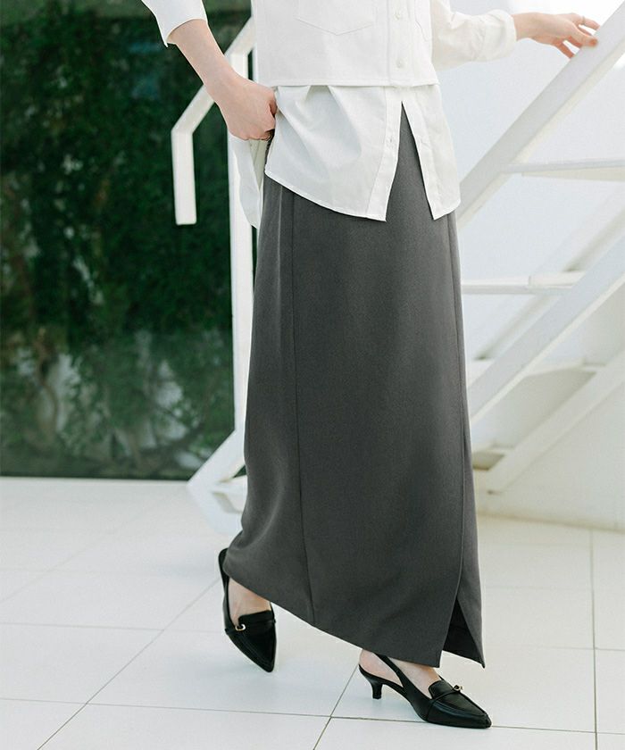 膝まで開いた裾スリットが女性らしい印象を与えてくれます。