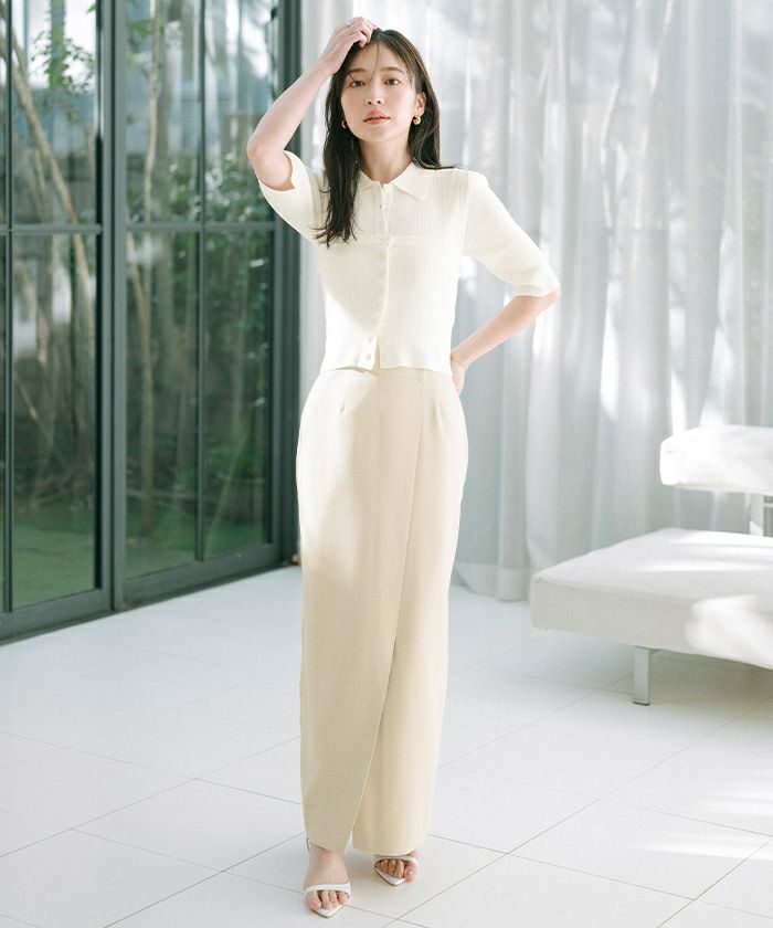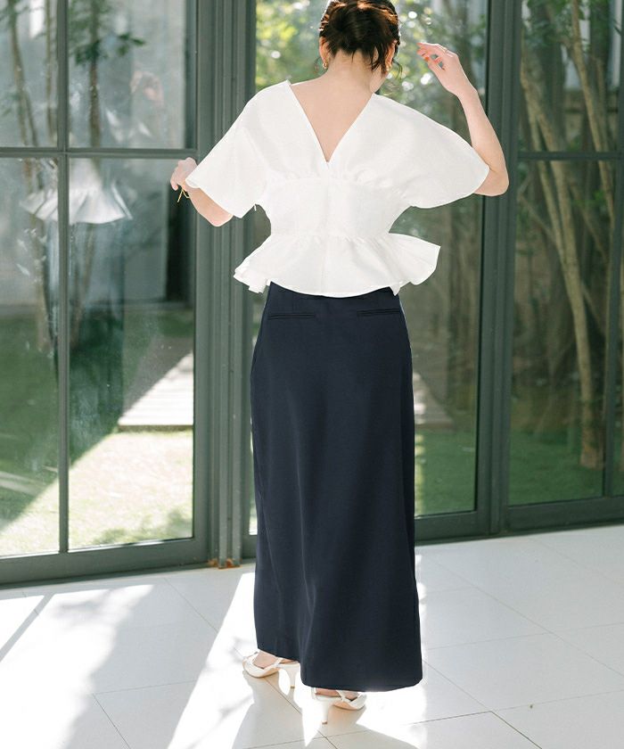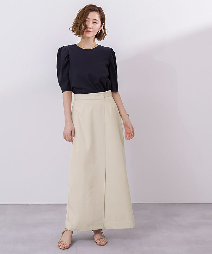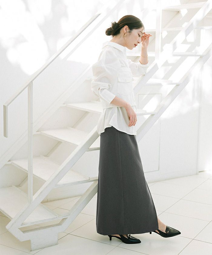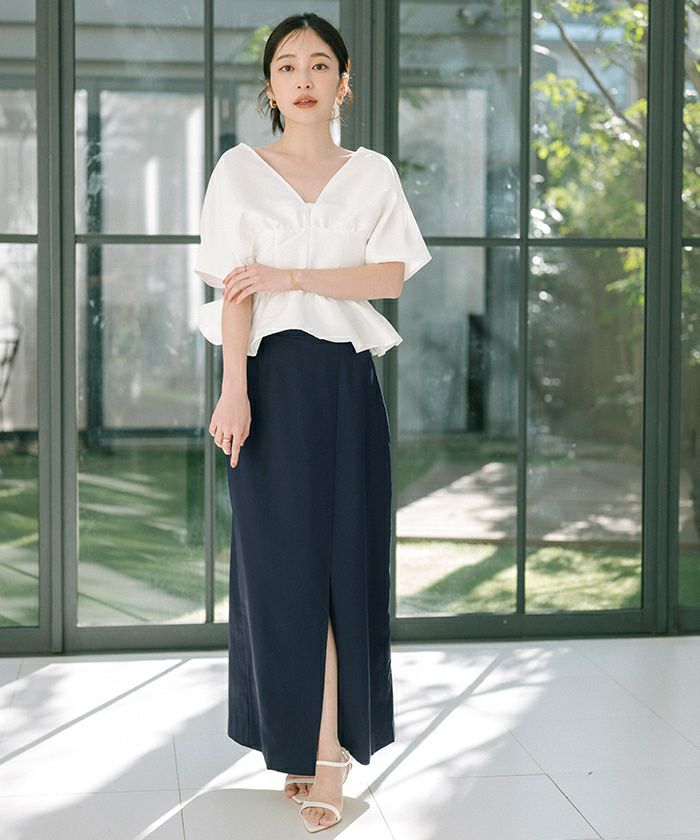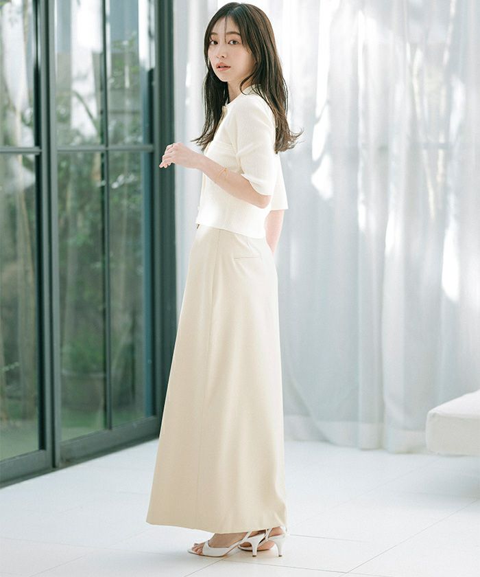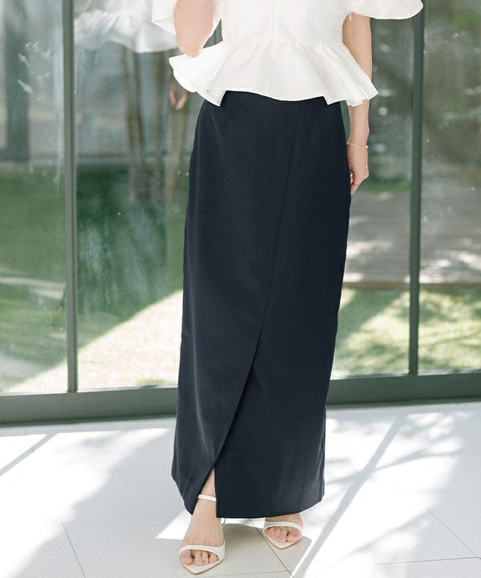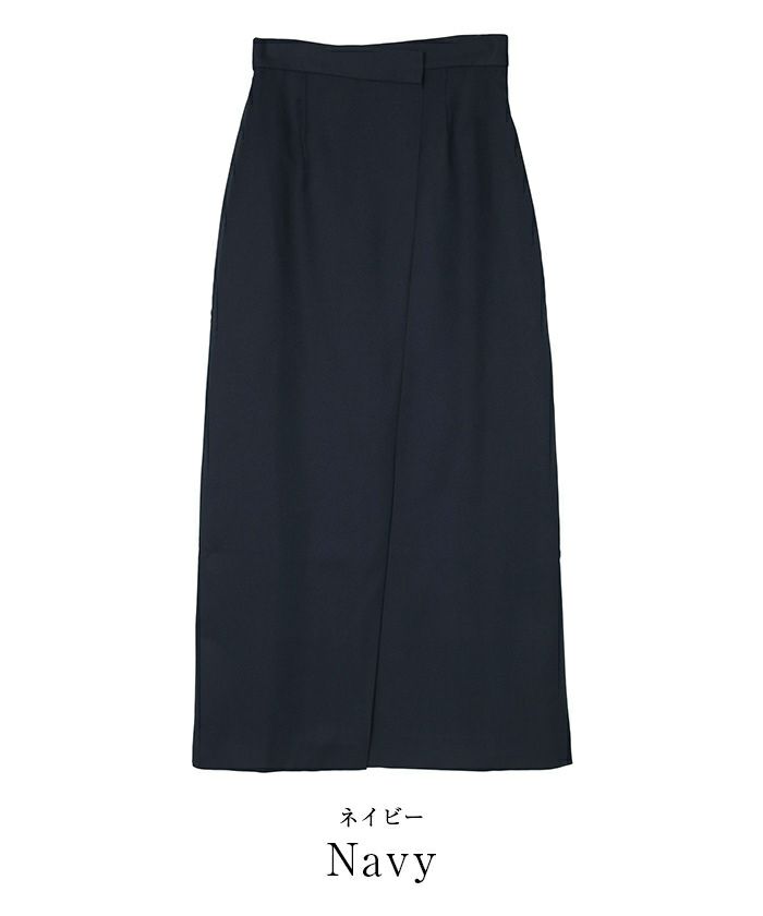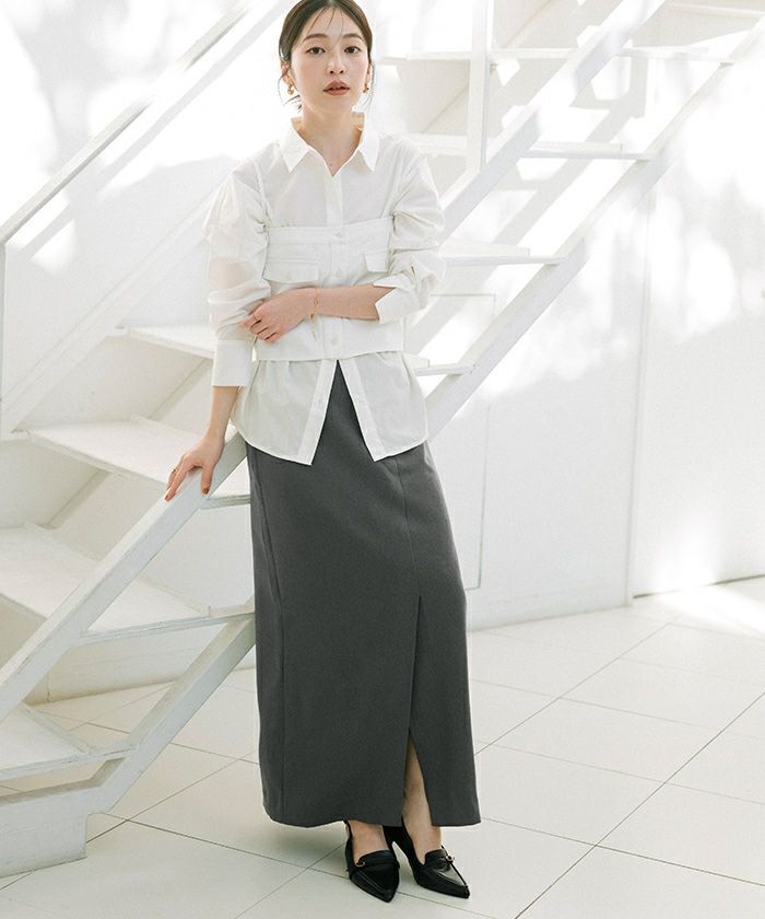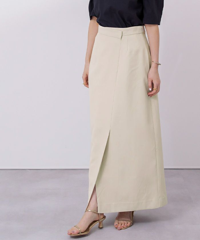膝まで開いた裾スリットが女性らしい印象を与えてくれます。
