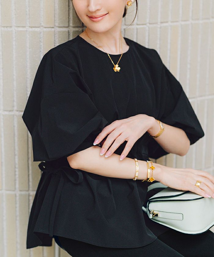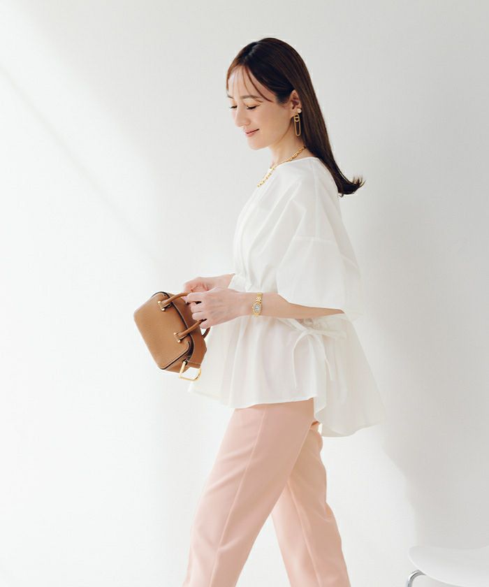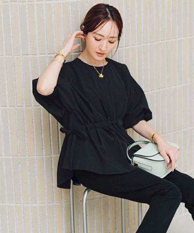 クルーネックウエストマークドロストブラウス