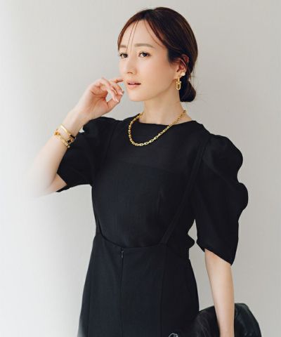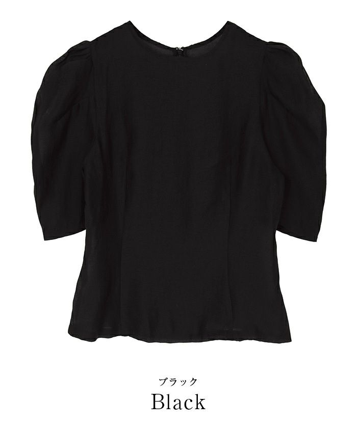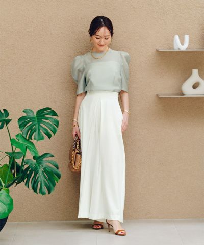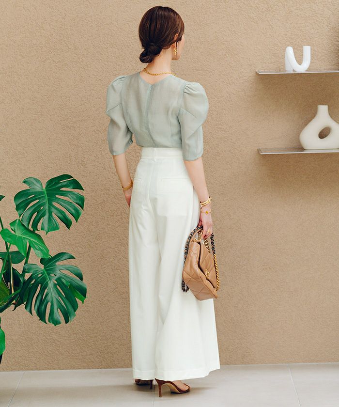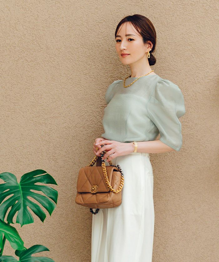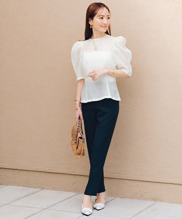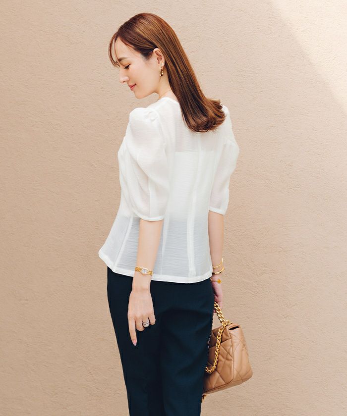 シアー感が春夏らしい印象を与えるパワーショルダートップス。