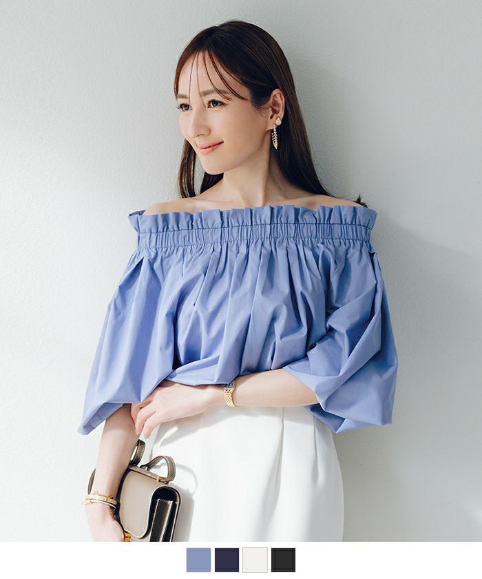 オフショルダーのトップスは、肩にしっかりと留まるように程よくフィットするサイズ感で仕立てられています。予めご了承ください。