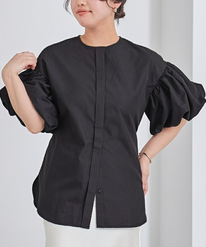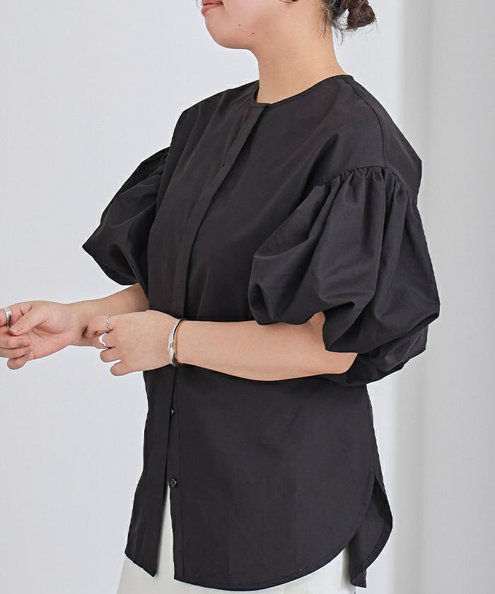 襟が付いていないシンプルなノーカラーでベーシックながらもこだわりのあるブラウスに仕上げました。