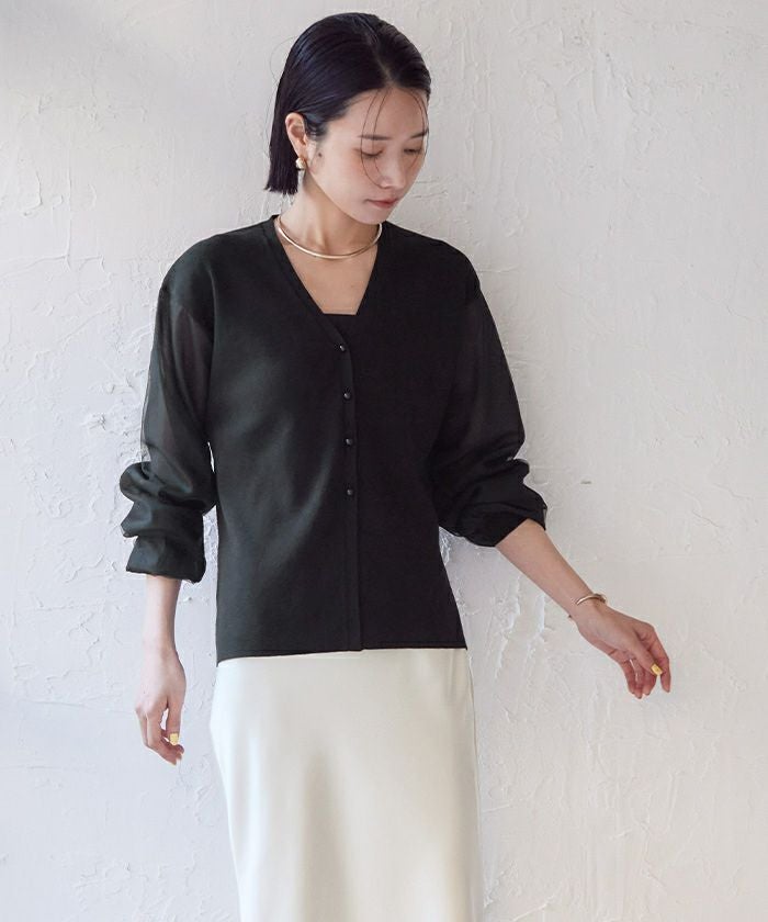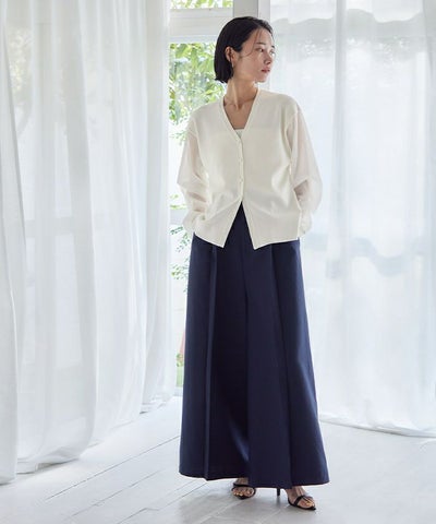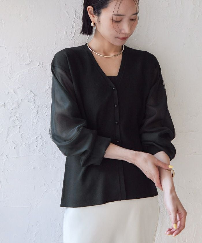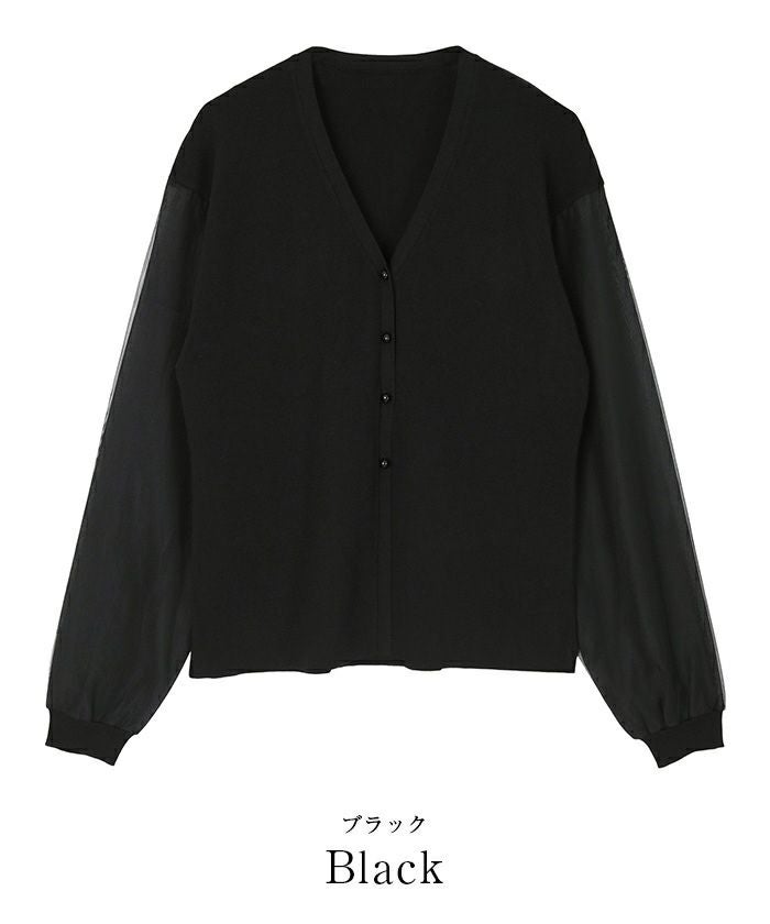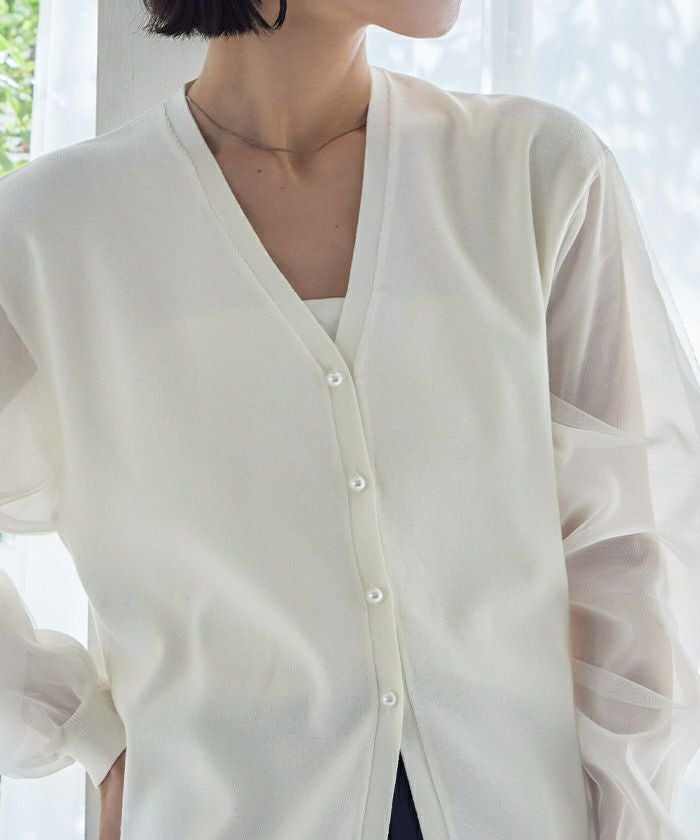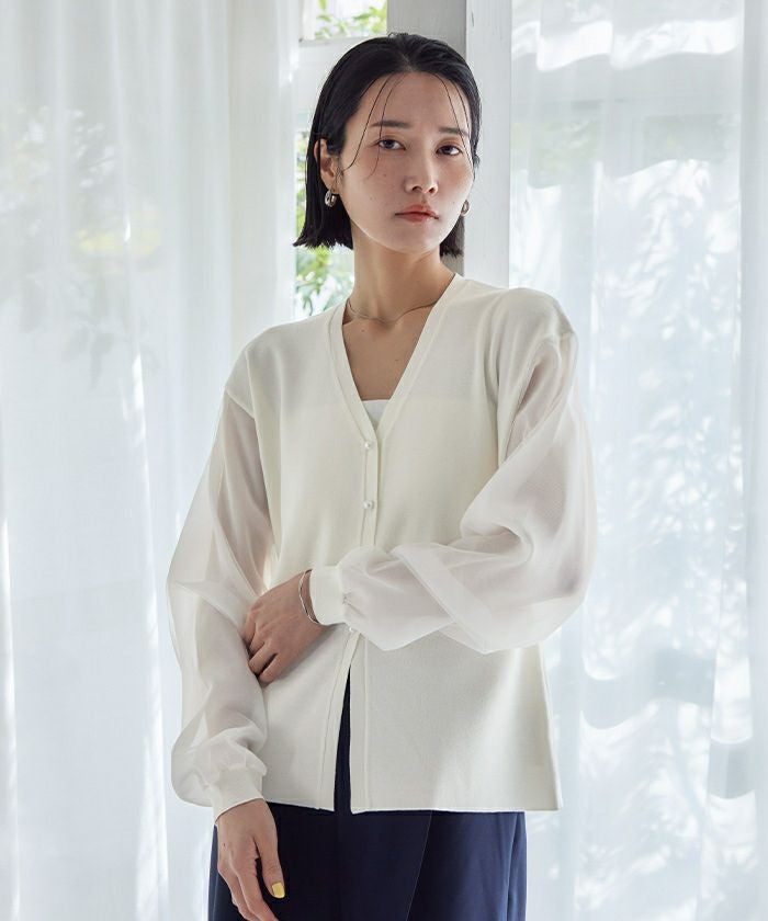 ニットとシアー素材をドッキングしたVネックカーディガン。