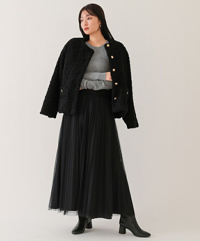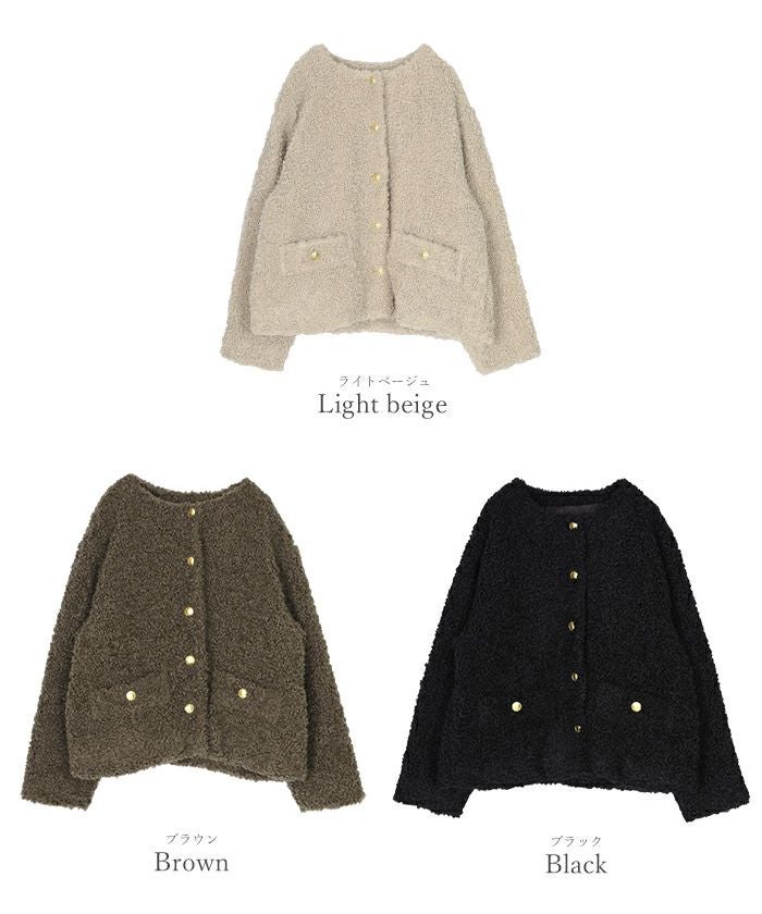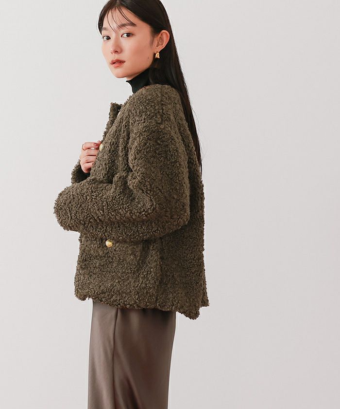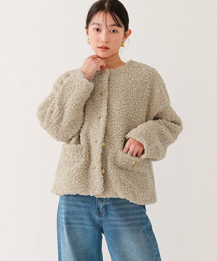 カジュアルになりがちなボア素材に、ゴールド釦をあしらうことで、程よく女性らしさをプラス。