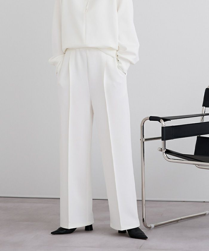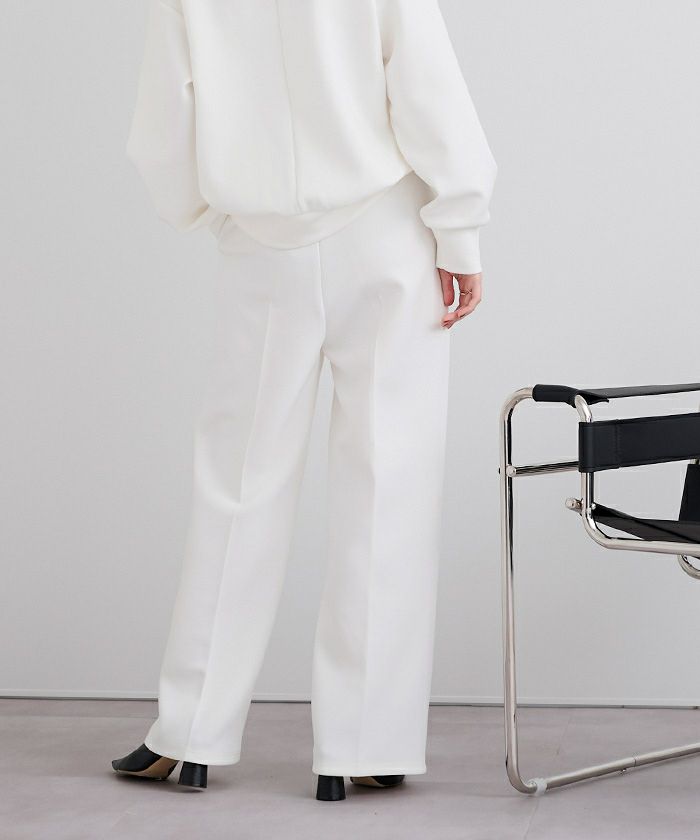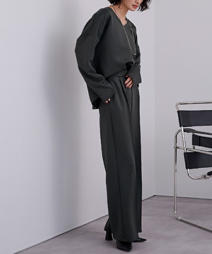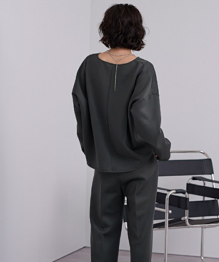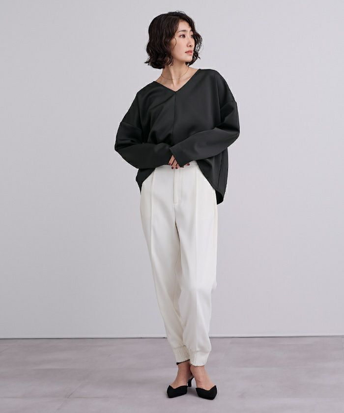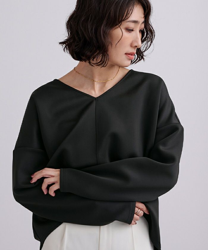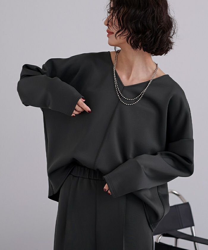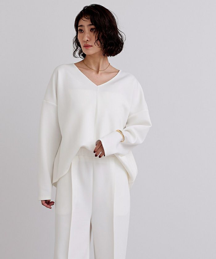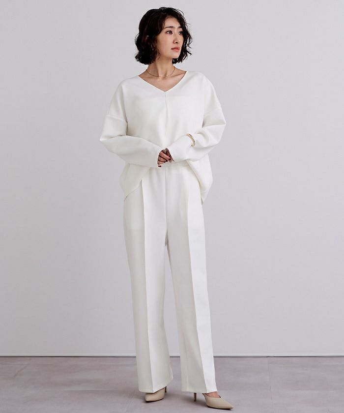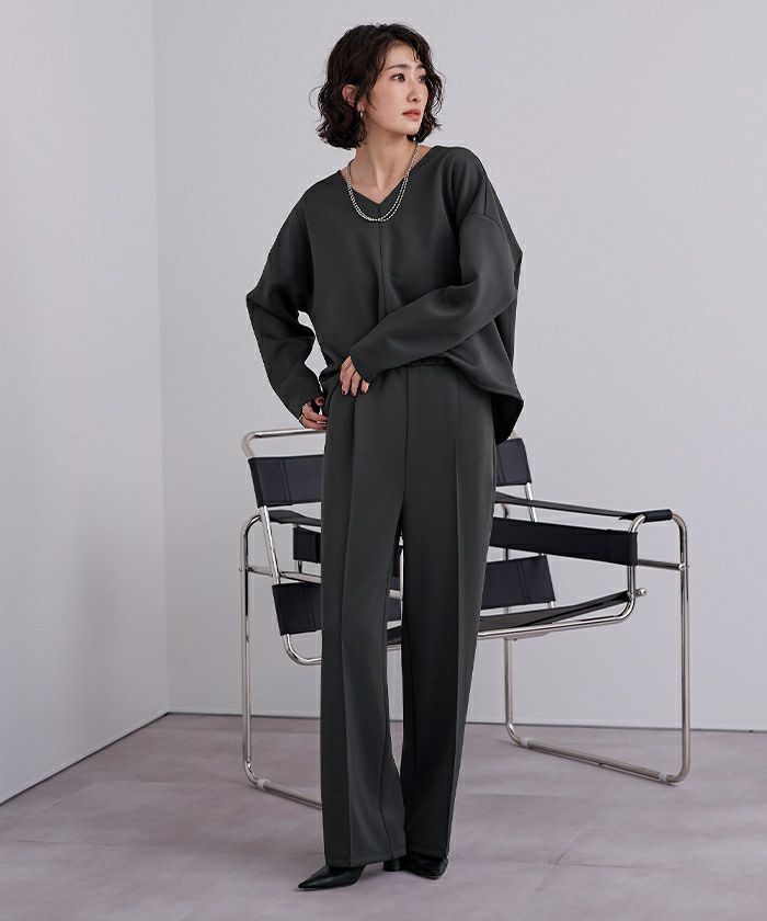 Vネックが顔まわりをすっきり見せ、センタープレス入りのパンツが上品な印象を演出。程よいハリ感のあるボンディング素材で、きちんと見えしながらも快適な着心地が魅力です。