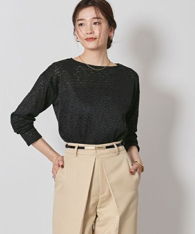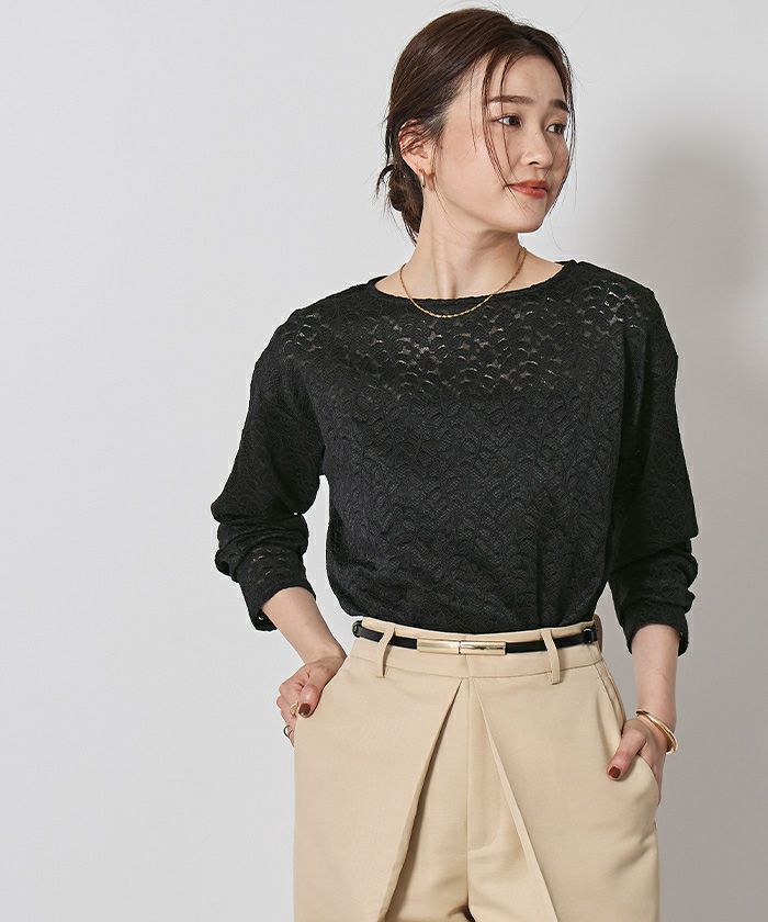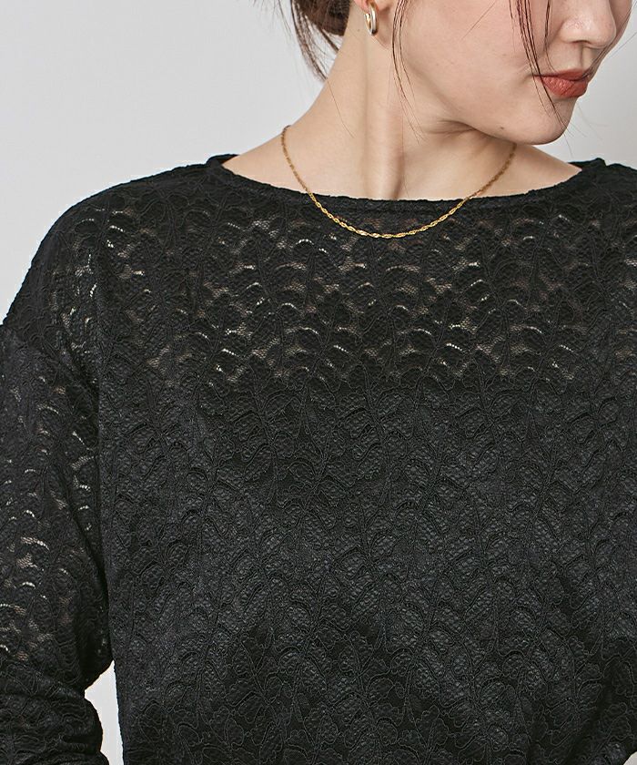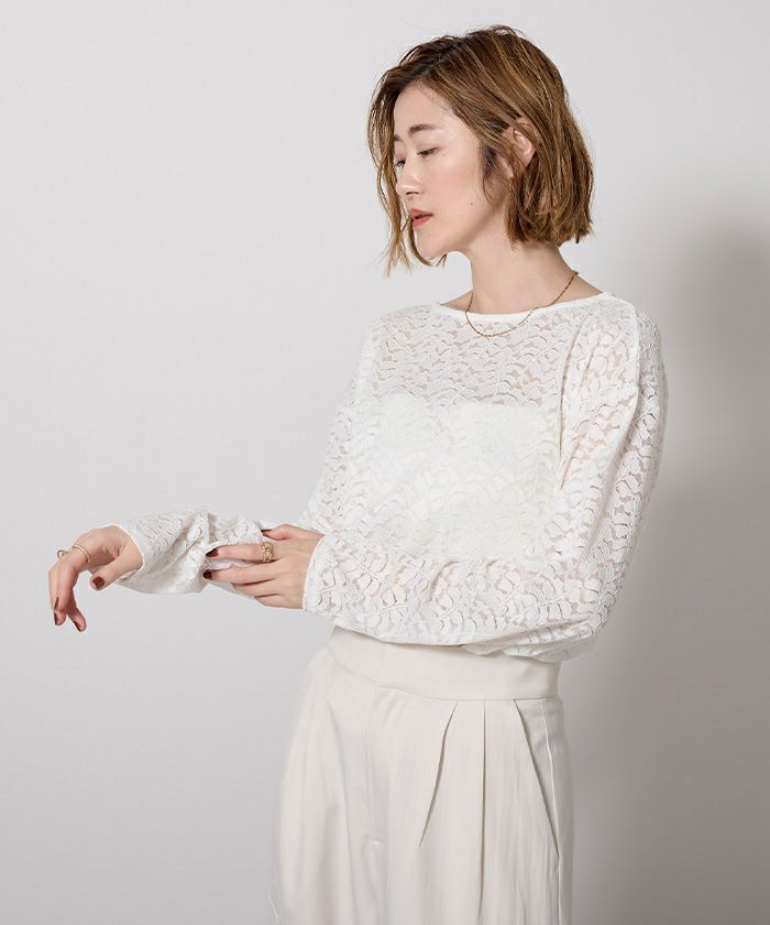 デコルテを美しく見せてくれるボートネックに、シンプルなシルエットが魅力のレーストップス。