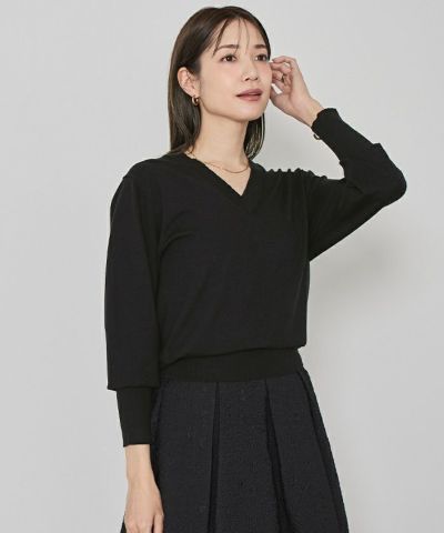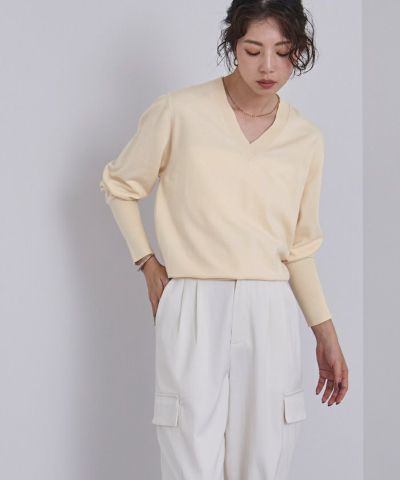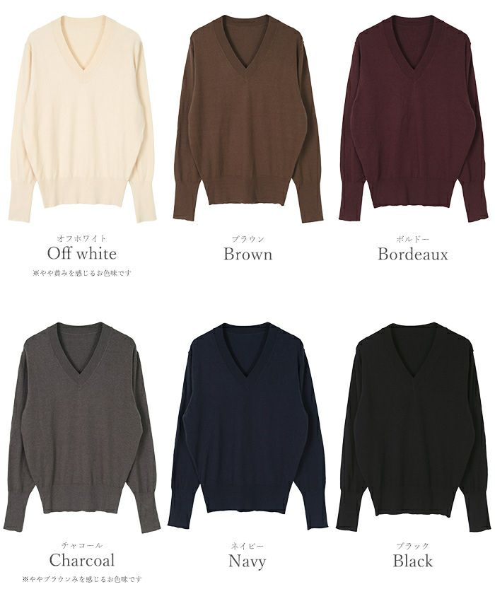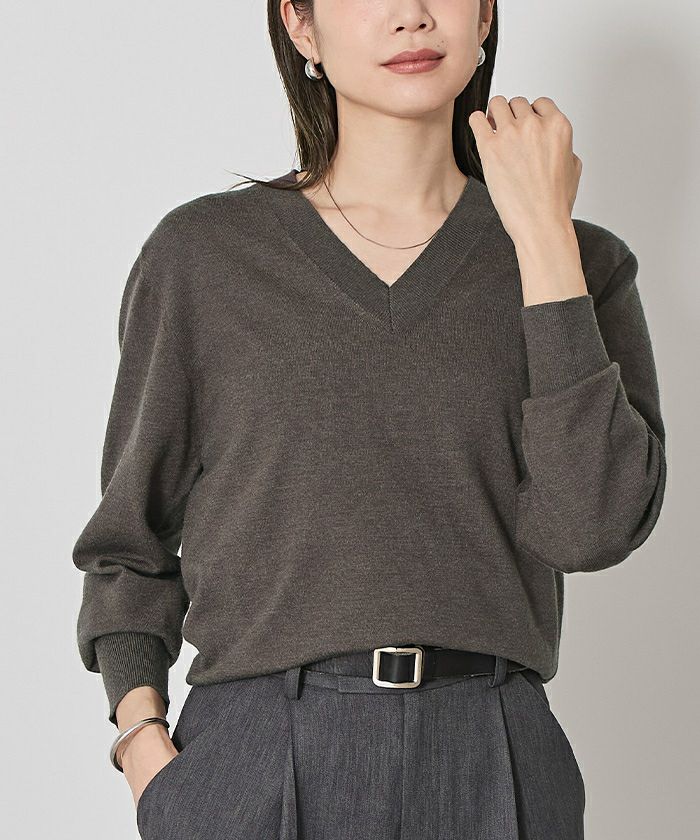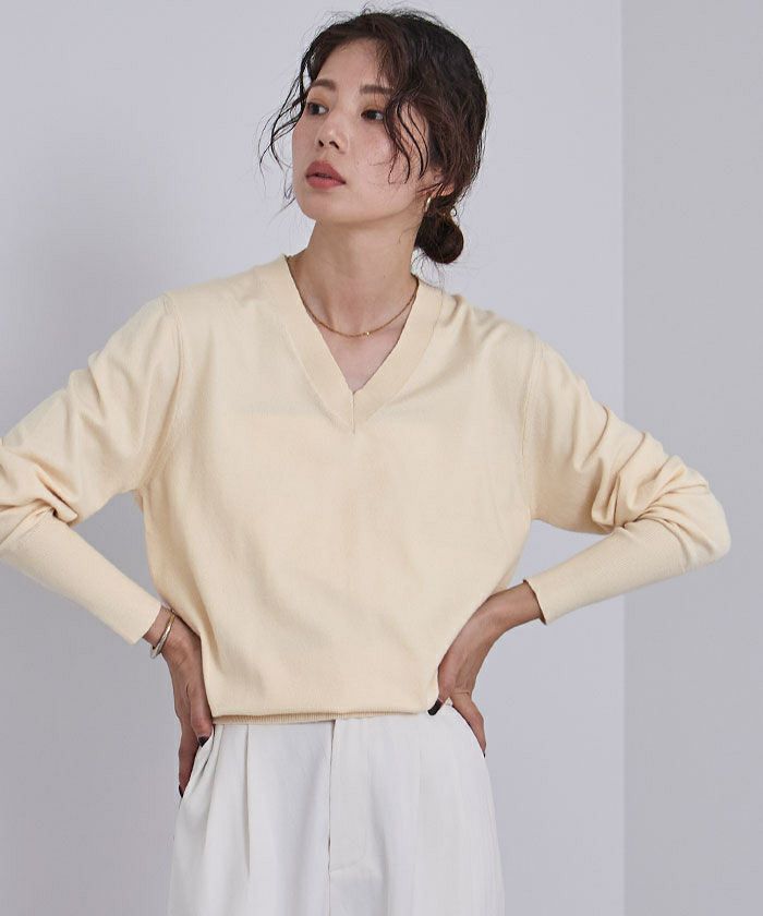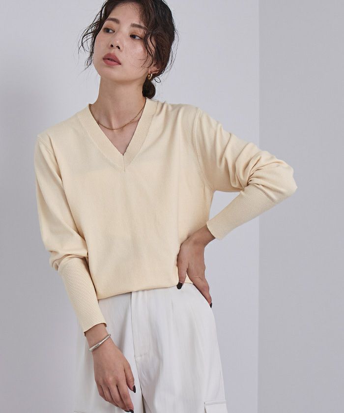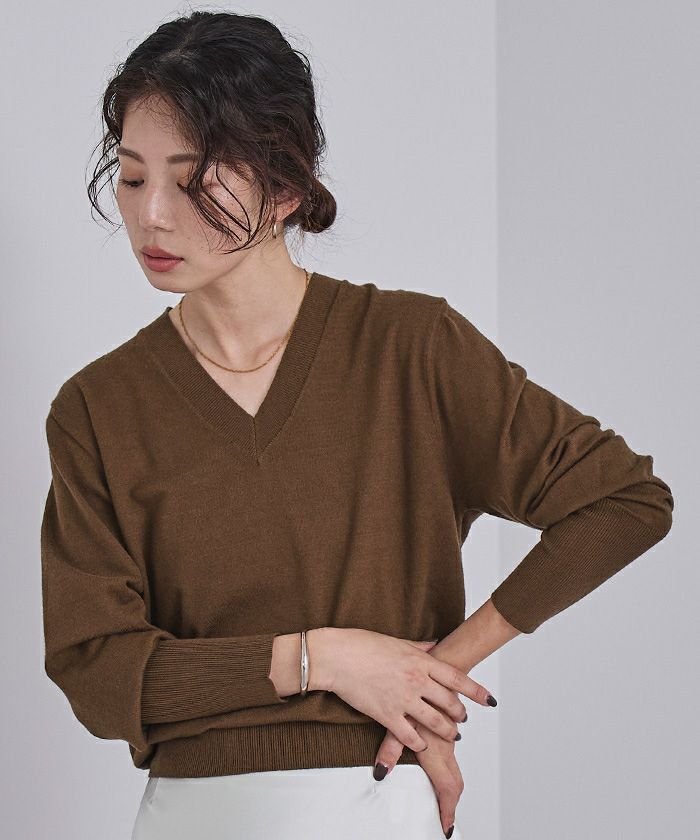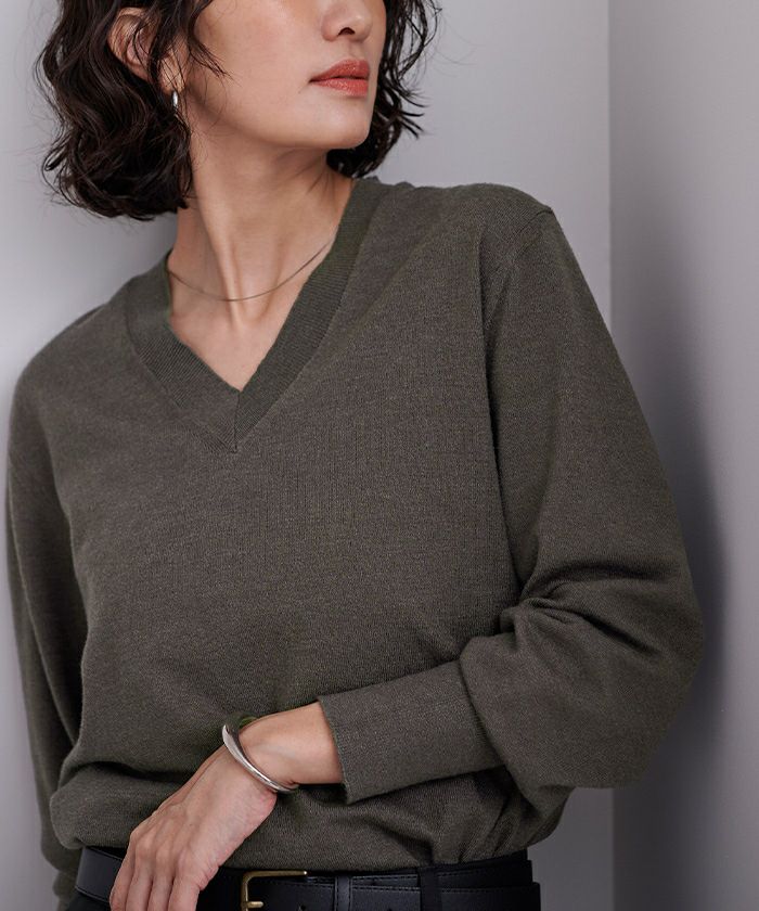 シンプルながらも女性らしさを引き立てるVネックデザインのニットは、1枚は持っておきたい万能アイテム。