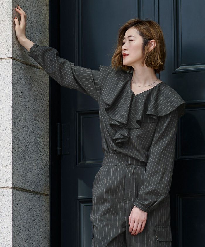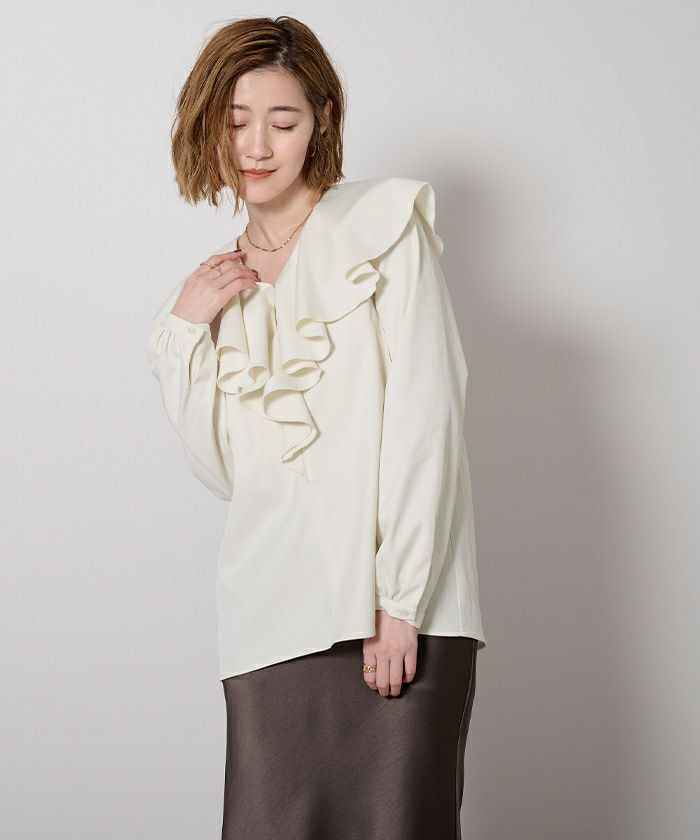 大ぶりなラッフルを大胆にあしらった華やかなブラウス。