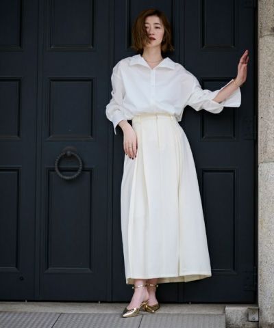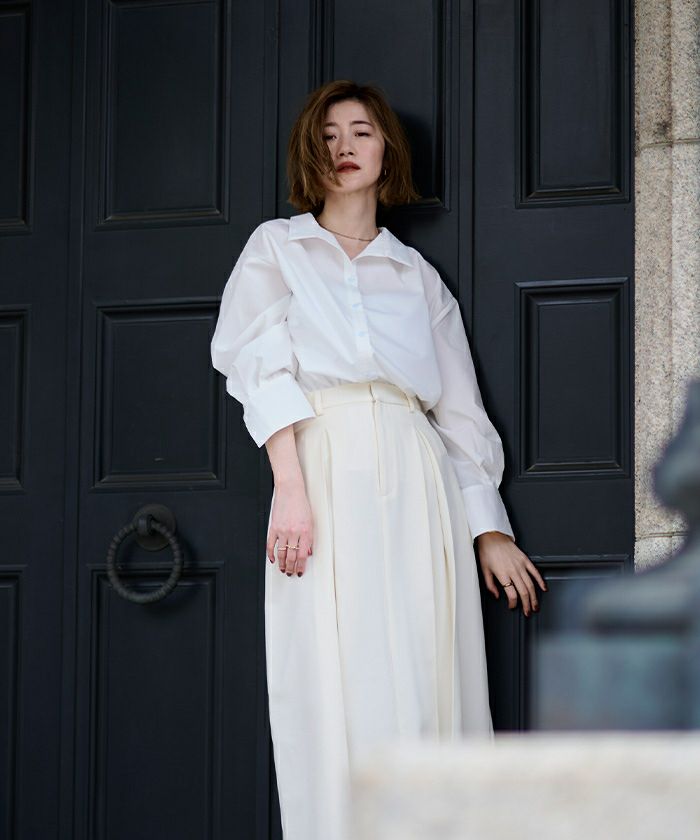 少しオーバーサイズなシルエットで、こなれた印象に仕上げました。抜け感のあるオープンネックが女性らしさを引き立てます。カラーはホワイト、ネイビー、ストライプの3色展開。シンプルなパンツと合わせれば、オフィスコーデにもぴったりです。
