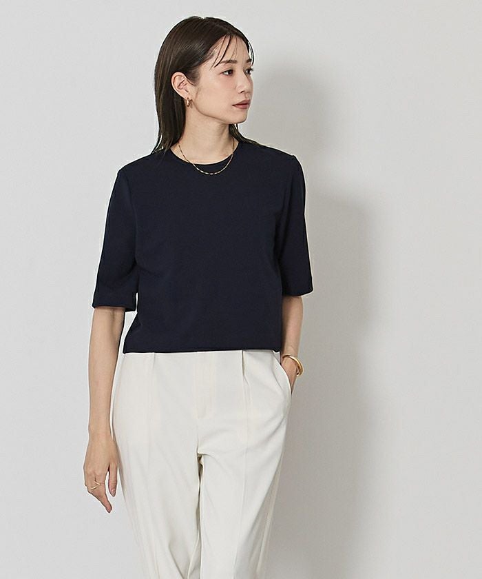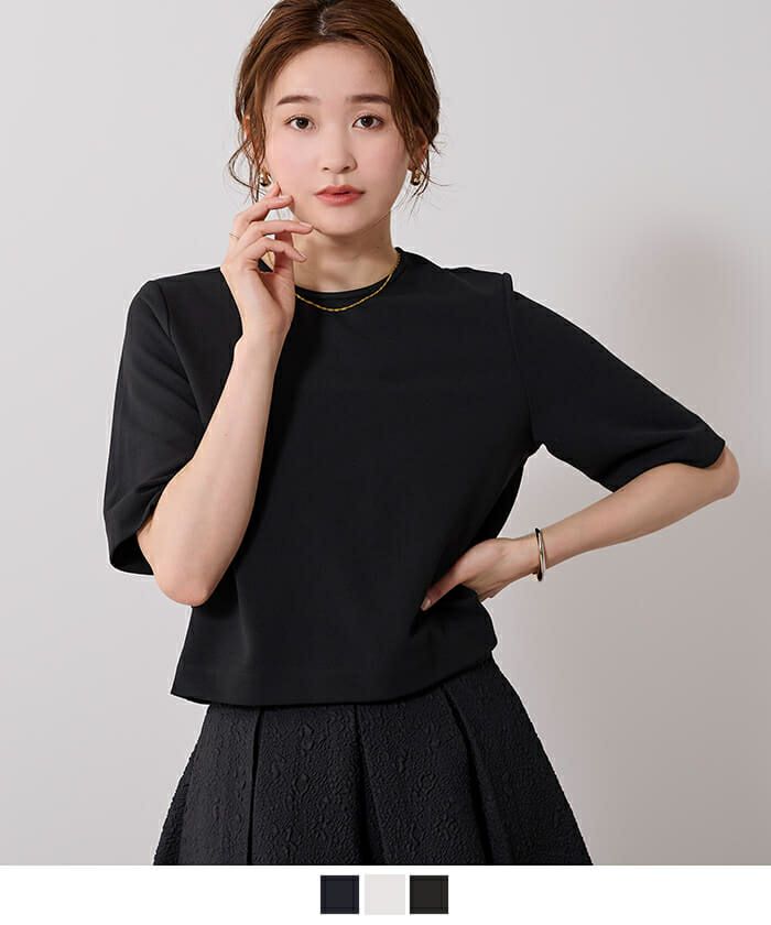 トレンド感のあるクロップド丈で、今年らしいスタイリングが楽しめます。カットジョーゼット素材を使用しているため、きちんと見えしながらもストレッチ性があり、快適な着心地を実現。さらに、ハーフスリーブが気になる二の腕をさりげなくカバーしてくれるのも嬉しいポイントです。