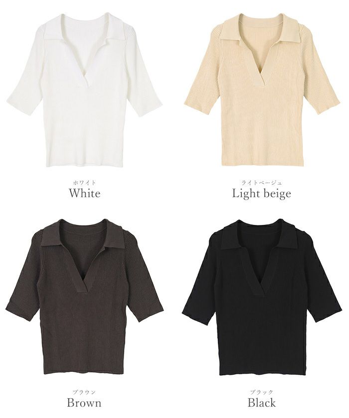 女性らしさ引き立つ、深めスキッパーデザインのポロニット