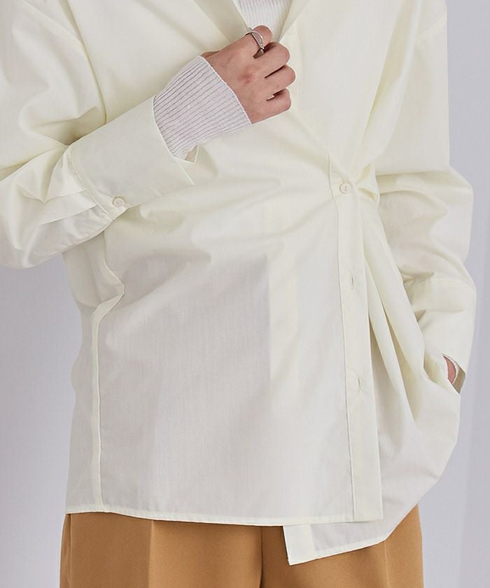 カシュクールにする際は前身頃を手で整えて頂き、釦ホールが自然な位置にくるように留めると着用できます。