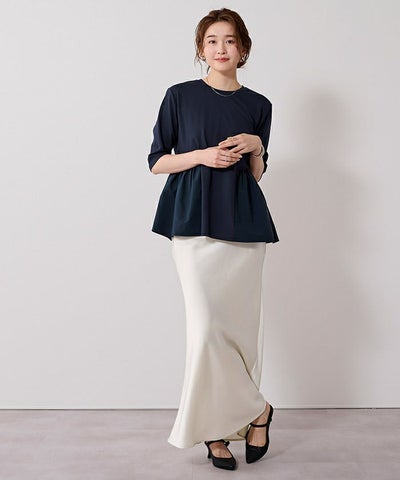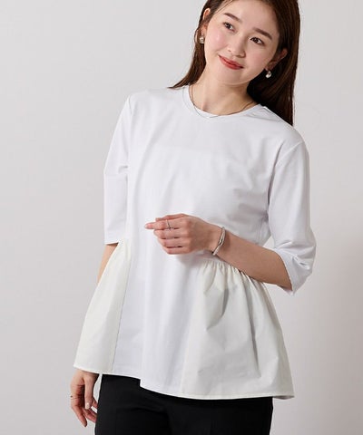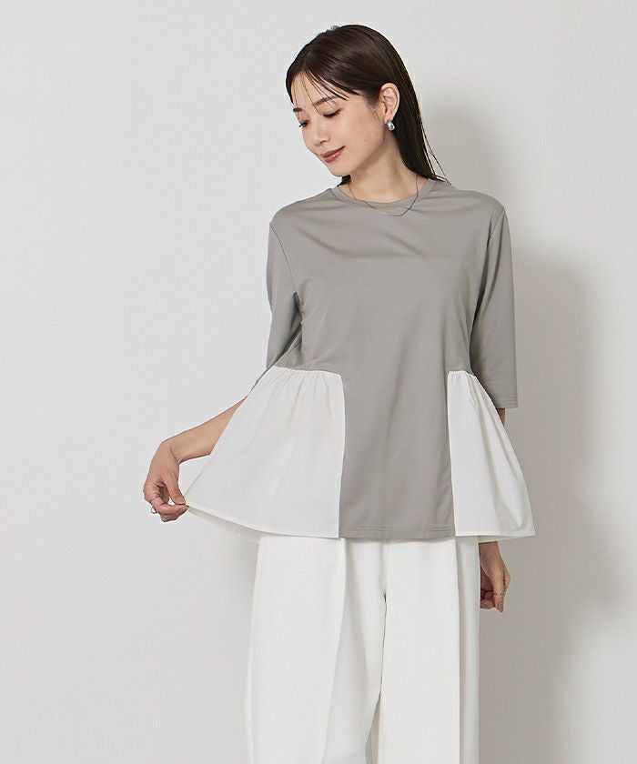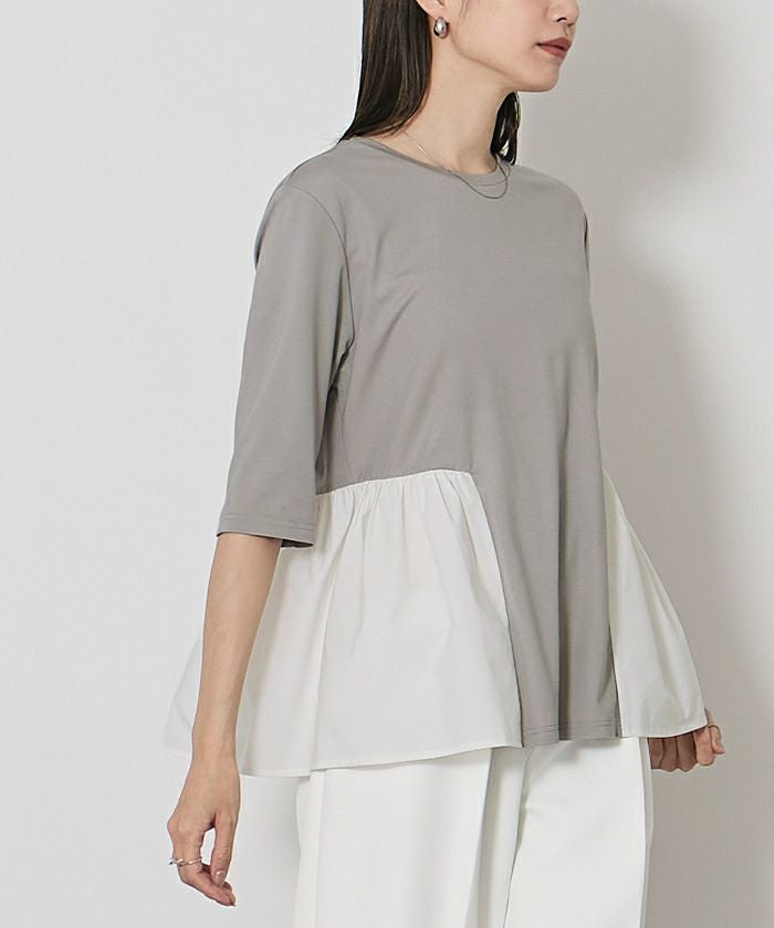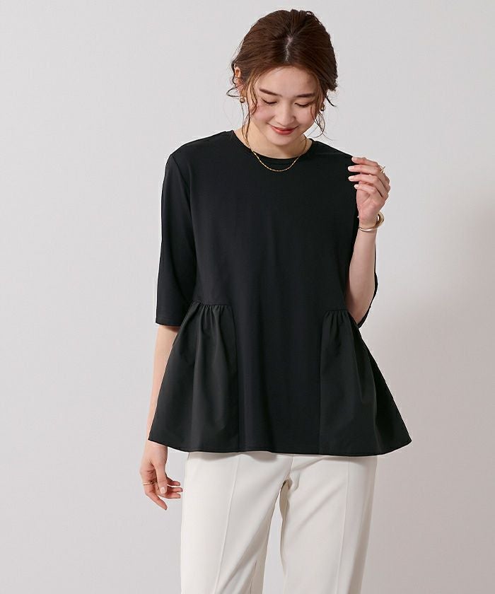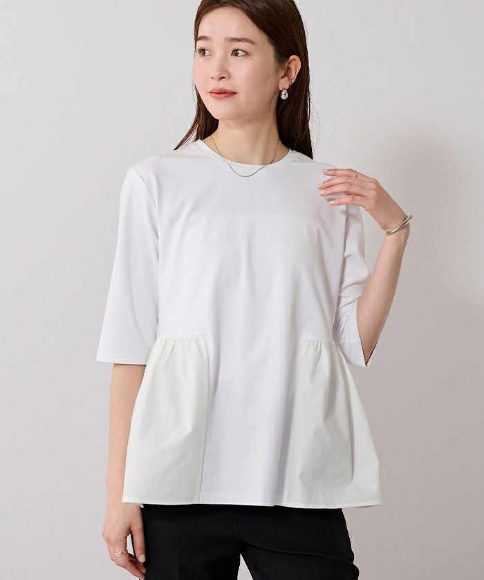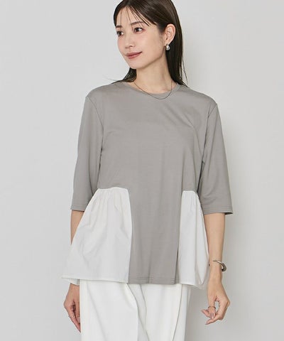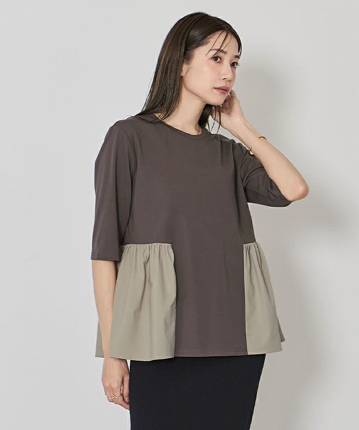 カジュアルなTシャツ素材と軽やかなタフタ素材を組み合わせ、裾にかけてふんわりと広がるシルエットが女性らしさを引き立てます。ウエストには切り替えを入れることで、自然にスタイルアップを叶え、メリハリのある着こなしに。二の腕をさりげなくカバーしてくれるハーフスリーブも嬉しいポイント。ニュアンスのあるグレーやチャコールのカラー展開で、スタイリングにこなれ感をプラスします。