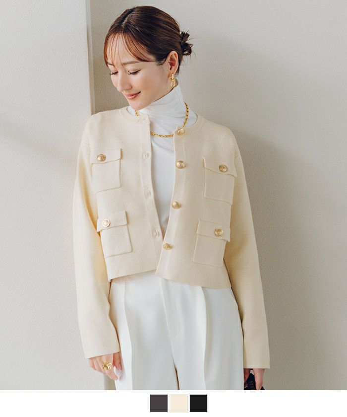 高級感のあるゴールド釦がアクセントのニットカーディガン/ジャケット。