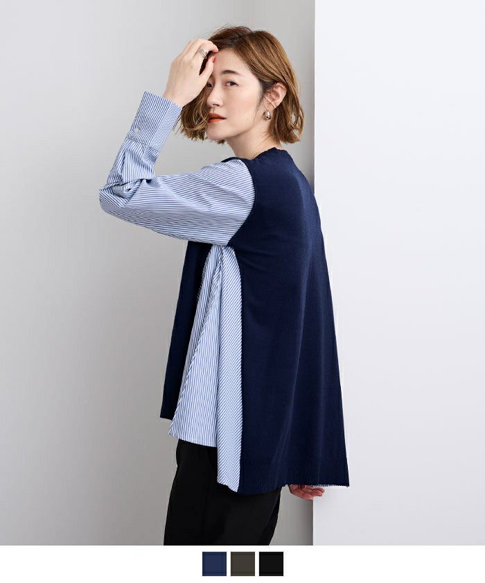 ニットと布帛シャツ生地をドッキングした、異素材ミックスデザイン。