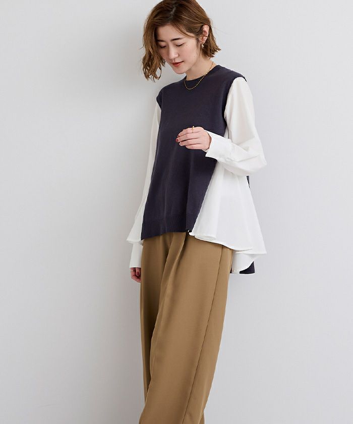 シャツとベストのレイヤード風で1枚で主役になるトップスです。