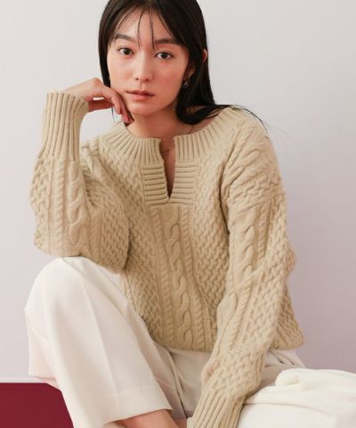 ケーブル編みの立体感と温かみのある素材で、1枚でおしゃれが決まるニットです。