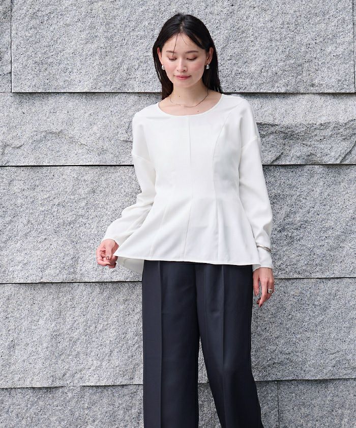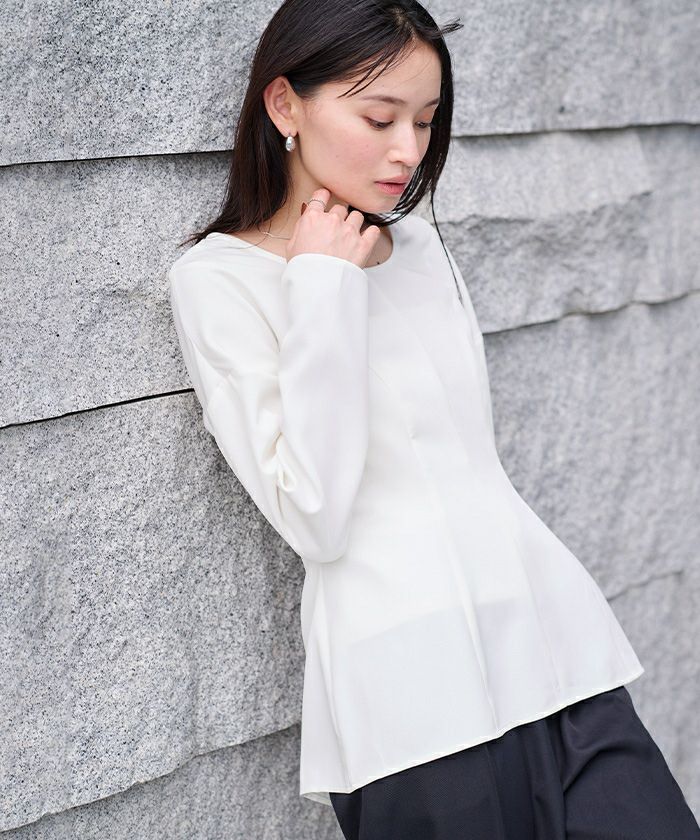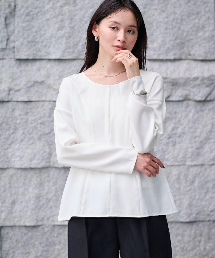 広めのラウンドネックがデコルテを美しく見せ、女性らしい印象に。