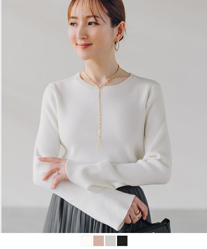 シンプルながらも女性らしさが際立つリブニットトップス。