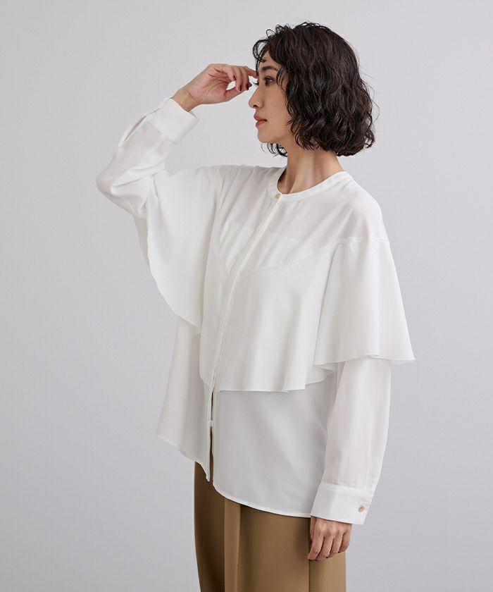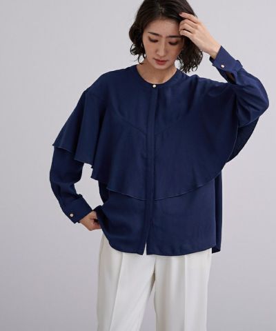 胸元のラッフルが大人可愛い印象を演出し、バンドカラーでハンサムな雰囲気をプラス。