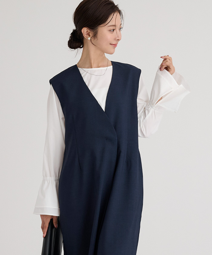 深めのVネックラインが顔周りをすっきり見せ、シャツとのレイヤードも美しく決まります。