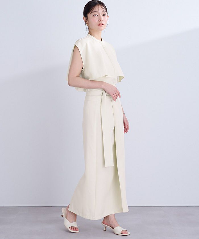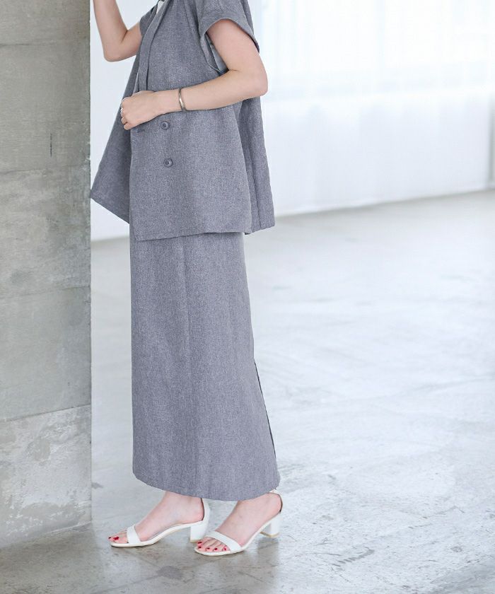 ナチュラルなリネン見えの風合いと、落ち感のきれいな素材感を生かした、上品なシルエットが特徴。