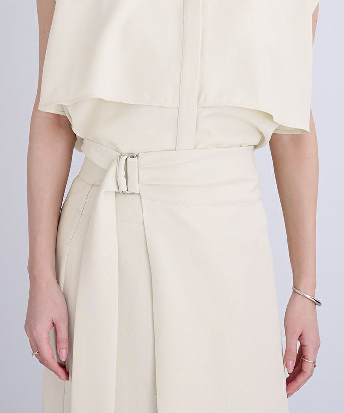 太めのウエストベルトとサイドバックルのディテールが腰位置を高く見せ、スタイルアップ効果が期待できるのもポイント。