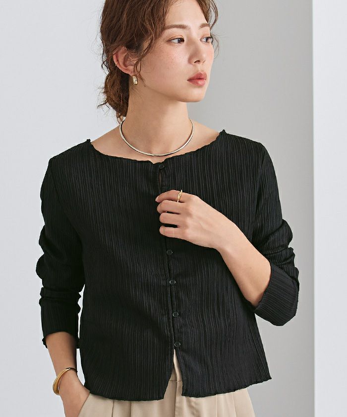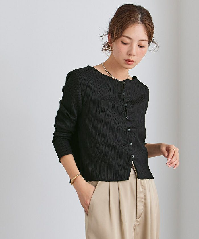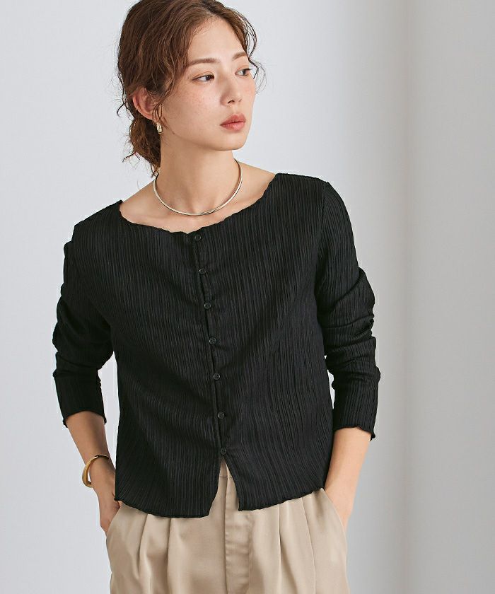表面に繊細な凹凸感のある生地で仕立てた、前後2WAY仕様のブラウス。