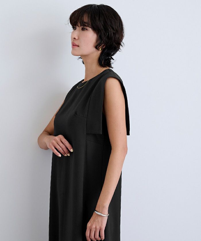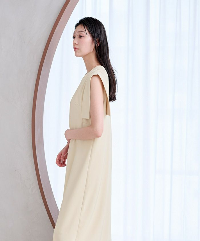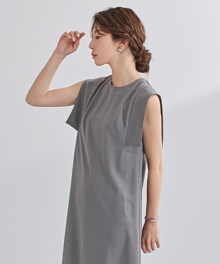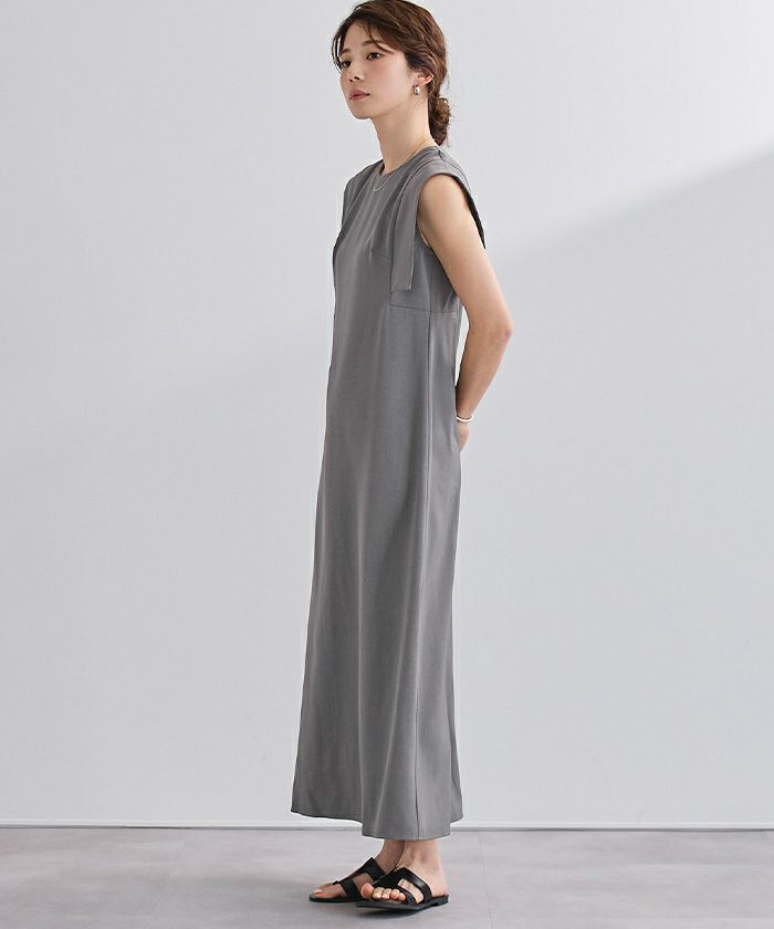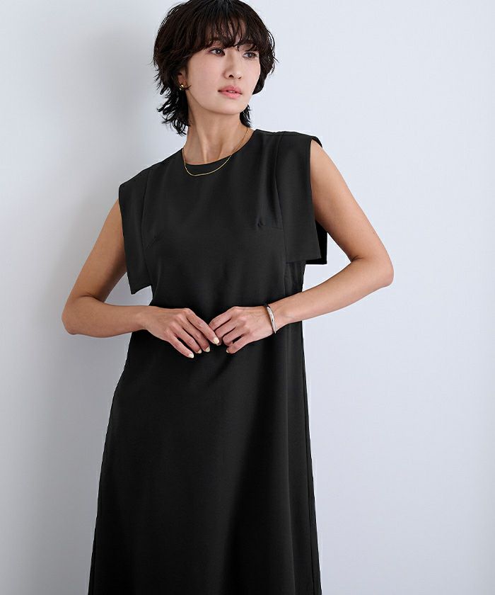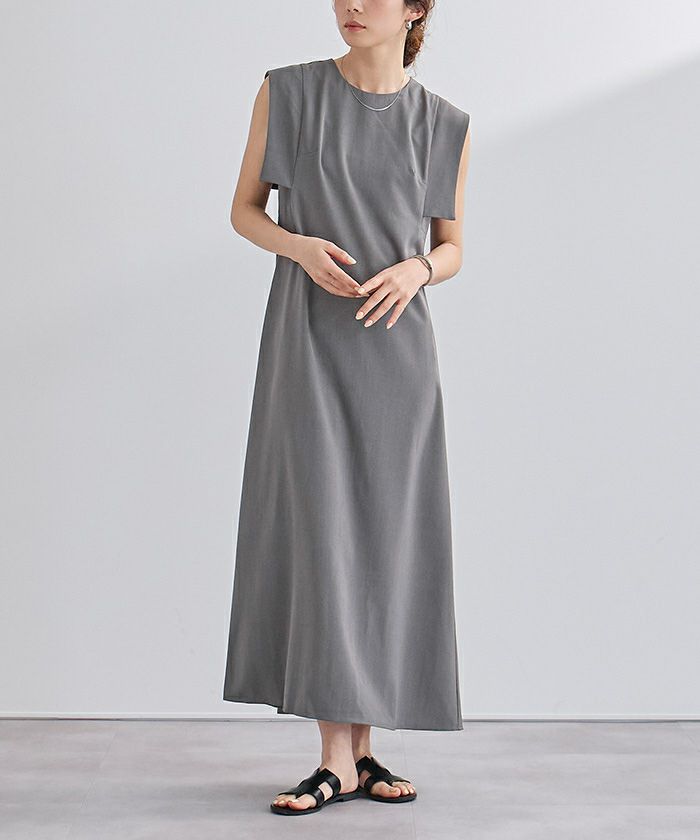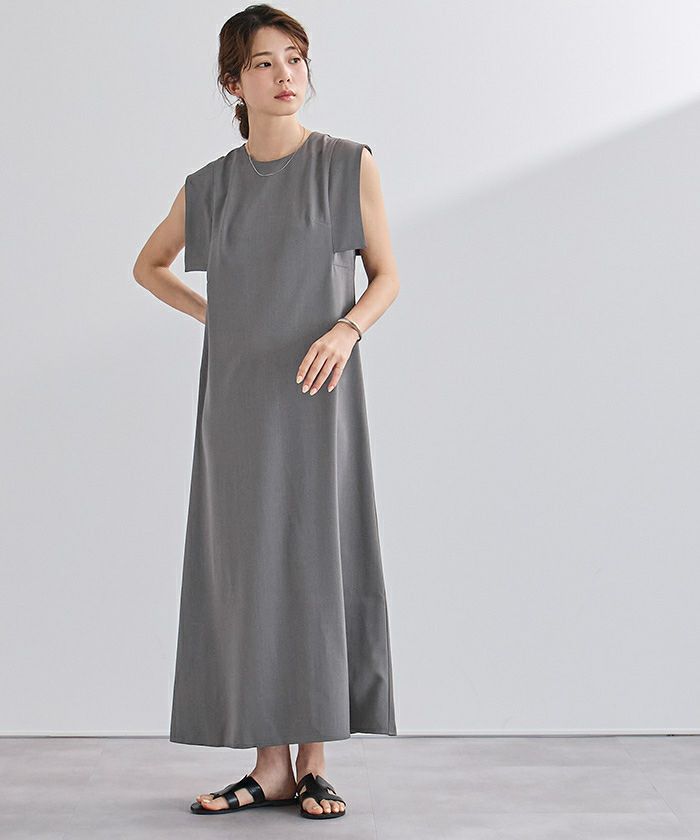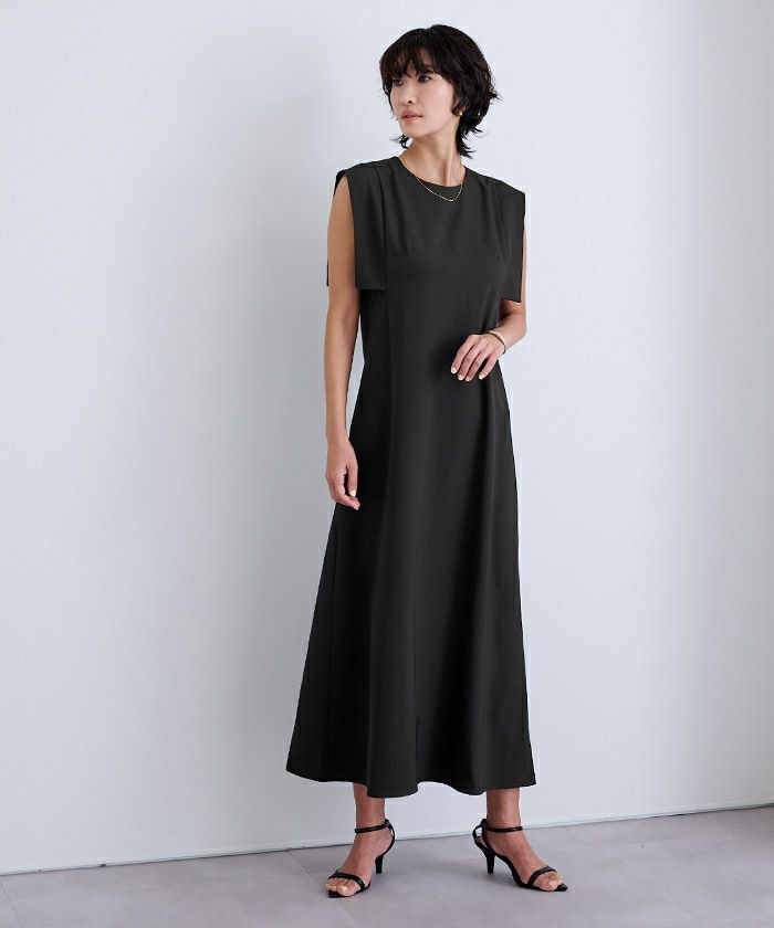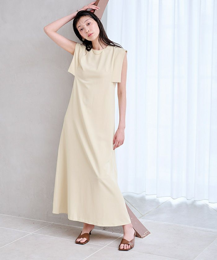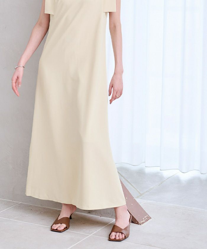 スクエアスリーブが気になる二の腕をさりげなくカバーしてくれるロングワンピース。