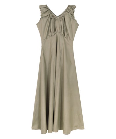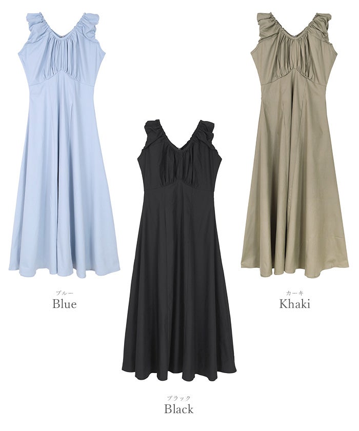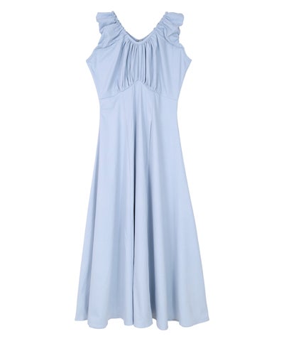ギャザーをたっぷり入れたネックラインが、デコルテをきれいに見せつつ女性らしい印象に。