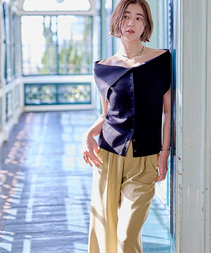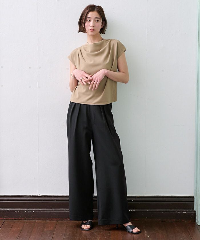 フロントに入れたタックとストンと落ちるラインで、脚のラインを拾いにくく、すっきりとした印象に仕上げています。